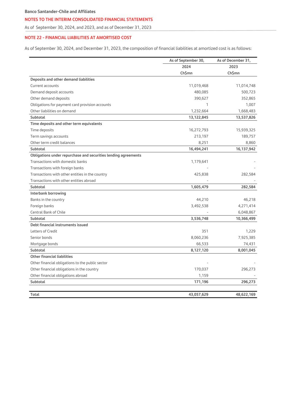 NOTE 22 - FINANCIAL LIABILITIES AT AMORTISED COST As of September 30, 2024, and December 31, 2023, the composition of financial liabilities at amortized cost is as follows:   As of September 30, As of December 31, 2024 2023   Ch$mn Ch$mn Deposits and other demand liabilities Current accounts 11,019,468 11,014,748 Demand deposit accounts 480,085 500,723 Other demand deposits 390,627 352,865 Obligations for payment card provision accounts 1 1,007 Other liabilities on demand 1,232,664 1,668,483 Subtotal 13,122,845 13,537,826 Time deposits and other term equivalents Time deposits 16,272,793 15,939,325 Term savings accounts 213,197 189,757 Other term credit balances 8,251 8,860 Subtotal 16,494,241 16,137,942 Obligations under repurchase and securities lending agreements Transactions with domestic banks 1,179,641 - Transactions with foreign banks - - Transactions with other entities in the country 425,838 282,584 Transactions with other entities abroad - - Subtotal 1,605,479 282,584 Interbank borrowing Banks in the country 44,210 46,218 Foreign banks 3,492,538 4,271,414 Central Bank of Chile - 6,048,867 Subtotal 3,536,748 10,366,499 Debt financial instruments issued Letters of Credit 351 1,229 Senior bonds 8,060,236 7,925,385 Mortgage bonds 66,533 74,431 Subtotal 8,127,120 8,001,045 Other financial liabilities Other financial obligations to the public sector - - Other financial obligations in the country 170,037 296,273 Other financial obligations abroad 1,159 - Subtotal 171,196 296,273 Total 43,057,629 48,622,169 Banco Santander-Chile and Affiliates NOTES TO THE INTERIM CONSOLIDATED FINANCIAL STATEMENTS As of September 30, 2024, and 2023, and as of December 31, 2023