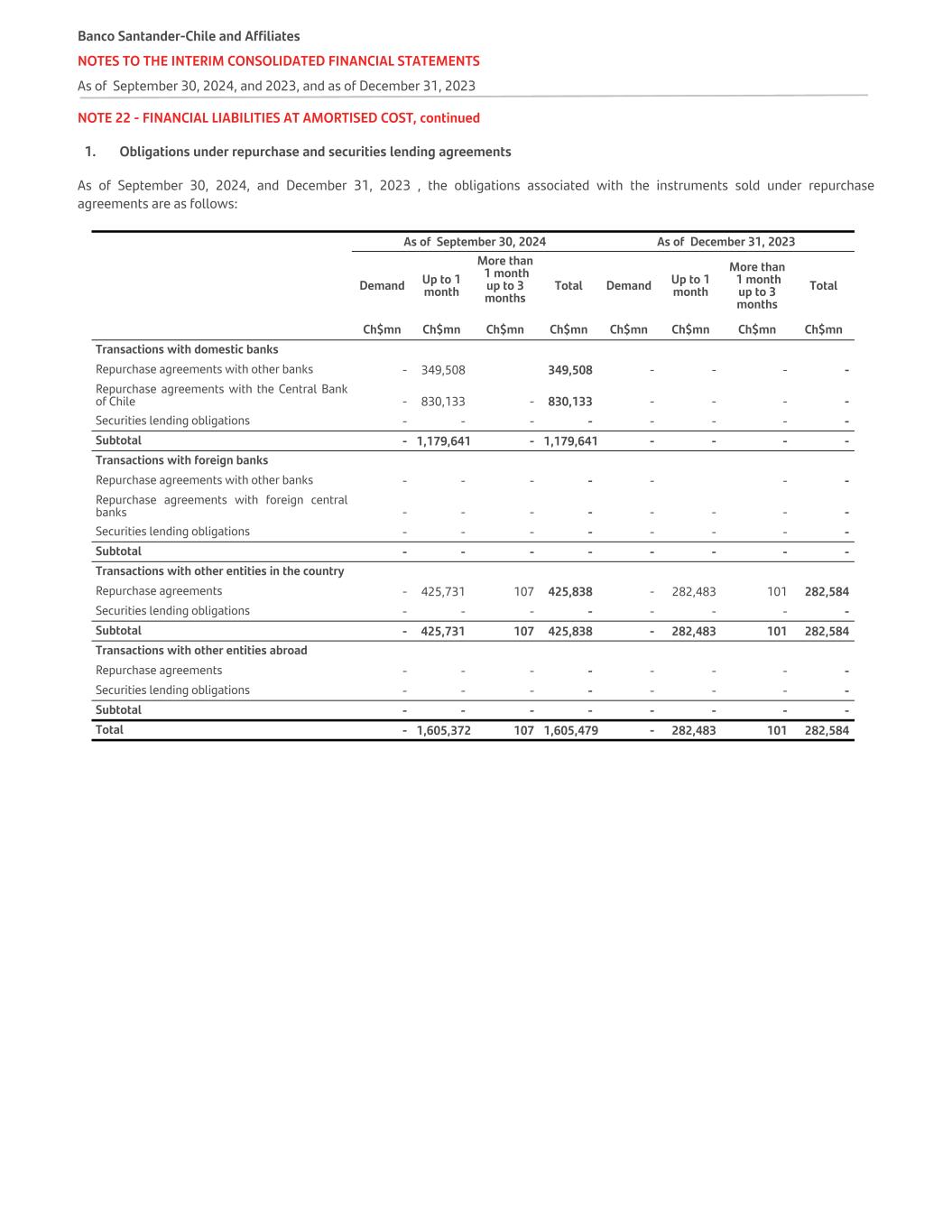 NOTE 22 - FINANCIAL LIABILITIES AT AMORTISED COST, continued 1. Obligations under repurchase and securities lending agreements As of September 30, 2024, and December 31, 2023 , the obligations associated with the instruments sold under repurchase agreements are as follows: As of September 30, 2024 As of December 31, 2023 Demand Up to 1 month More than 1 month up to 3 months Total Demand Up to 1 month More than 1 month up to 3 months Total Ch$mn Ch$mn Ch$mn Ch$mn Ch$mn Ch$mn Ch$mn Ch$mn Transactions with domestic banks Repurchase agreements with other banks - 349,508 349,508 - - - - Repurchase agreements with the Central Bank of Chile - 830,133 - 830,133 - - - - Securities lending obligations - - - - - - - - Subtotal - 1,179,641 - 1,179,641 - - - - Transactions with foreign banks Repurchase agreements with other banks - - - - - - - Repurchase agreements with foreign central banks - - - - - - - - Securities lending obligations - - - - - - - - Subtotal - - - - - - - - Transactions with other entities in the country Repurchase agreements - 425,731 107 425,838 - 282,483 101 282,584 Securities lending obligations - - - - - - - - Subtotal - 425,731 107 425,838 - 282,483 101 282,584 Transactions with other entities abroad Repurchase agreements - - - - - - - - Securities lending obligations - - - - - - - - Subtotal - - - - - - - - Total - 1,605,372 107 1,605,479 - 282,483 101 282,584 Banco Santander-Chile and Affiliates NOTES TO THE INTERIM CONSOLIDATED FINANCIAL STATEMENTS As of September 30, 2024, and 2023, and as of December 31, 2023