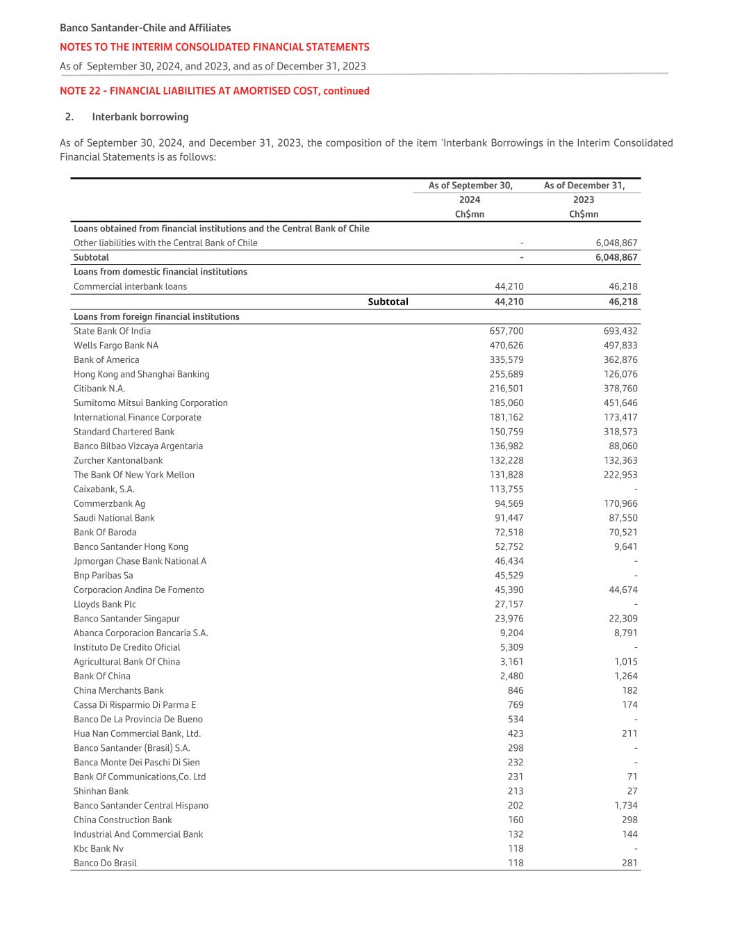 NOTE 22 - FINANCIAL LIABILITIES AT AMORTISED COST, continued 2. Interbank borrowing As of September 30, 2024, and December 31, 2023, the composition of the item 'Interbank Borrowings in the Interim Consolidated Financial Statements is as follows:   As of September 30, As of December 31, 2024 2023   Ch$mn Ch$mn Loans obtained from financial institutions and the Central Bank of Chile Other liabilities with the Central Bank of Chile - 6,048,867 Subtotal - 6,048,867 Loans from domestic financial institutions Commercial interbank loans 44,210 46,218 Subtotal 44,210 46,218 Loans from foreign financial institutions State Bank Of India 657,700 693,432 Wells Fargo Bank NA 470,626 497,833 Bank of America 335,579 362,876 Hong Kong and Shanghai Banking 255,689 126,076 Citibank N.A. 216,501 378,760 Sumitomo Mitsui Banking Corporation 185,060 451,646 International Finance Corporate 181,162 173,417 Standard Chartered Bank 150,759 318,573 Banco Bilbao Vizcaya Argentaria 136,982 88,060 Zurcher Kantonalbank 132,228 132,363 The Bank Of New York Mellon 131,828 222,953 Caixabank, S.A. 113,755 - Commerzbank Ag 94,569 170,966 Saudi National Bank 91,447 87,550 Bank Of Baroda 72,518 70,521 Banco Santander Hong Kong 52,752 9,641 Jpmorgan Chase Bank National A 46,434 - Bnp Paribas Sa 45,529 - Corporacion Andina De Fomento 45,390 44,674 Lloyds Bank Plc 27,157 - Banco Santander Singapur 23,976 22,309 Abanca Corporacion Bancaria S.A. 9,204 8,791 Instituto De Credito Oficial 5,309 - Agricultural Bank Of China 3,161 1,015 Bank Of China 2,480 1,264 China Merchants Bank 846 182 Cassa Di Risparmio Di Parma E 769 174 Banco De La Provincia De Bueno 534 - Hua Nan Commercial Bank, Ltd. 423 211 Banco Santander (Brasil) S.A. 298 - Banca Monte Dei Paschi Di Sien 232 - Bank Of Communications,Co. Ltd 231 71 Shinhan Bank 213 27 Banco Santander Central Hispano 202 1,734 China Construction Bank 160 298 Industrial And Commercial Bank 132 144 Kbc Bank Nv 118 - Banco Do Brasil 118 281 Banco Santander-Chile and Affiliates NOTES TO THE INTERIM CONSOLIDATED FINANCIAL STATEMENTS As of September 30, 2024, and 2023, and as of December 31, 2023