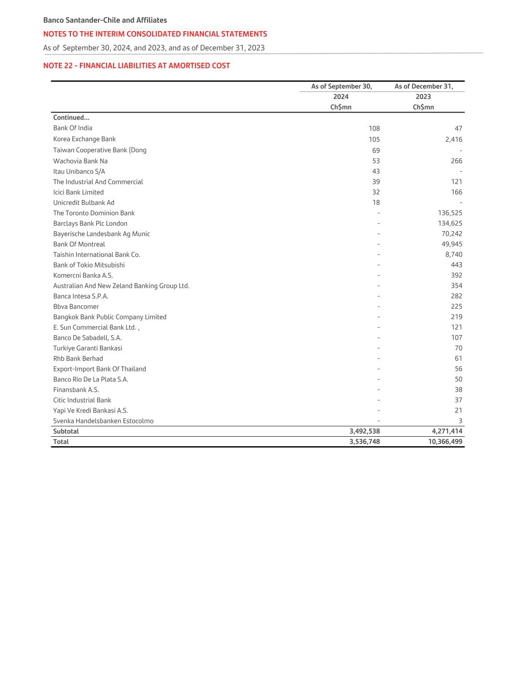 NOTE 22 - FINANCIAL LIABILITIES AT AMORTISED COST   As of September 30, As of December 31, 2024 2023   Ch$mn Ch$mn Continued... Bank Of India 108 47 Korea Exchange Bank 105 2,416 Taiwan Cooperative Bank (Dong 69 - Wachovia Bank Na 53 266 Itau Unibanco S/A 43 - The Industrial And Commercial 39 121 Icici Bank Limited 32 166 Unicredit Bulbank Ad 18 - The Toronto Dominion Bank - 136,525 Barclays Bank Plc London - 134,625 Bayerische Landesbank Ag Munic - 70,242 Bank Of Montreal - 49,945 Taishin International Bank Co. - 8,740 Bank of Tokio Mitsubishi - 443 Komercni Banka A.S. - 392 Australian And New Zeland Banking Group Ltd. - 354 Banca Intesa S.P.A. - 282 Bbva Bancomer - 225 Bangkok Bank Public Company Limited - 219 E. Sun Commercial Bank Ltd. , - 121 Banco De Sabadell, S.A. - 107 Turkiye Garanti Bankasi - 70 Rhb Bank Berhad - 61 Export-Import Bank Of Thailand - 56 Banco Rio De La Plata S.A. - 50 Finansbank A.S. - 38 Citic Industrial Bank - 37 Yapi Ve Kredi Bankasi A.S. - 21 Svenka Handelsbanken Estocolmo - 3 Subtotal 3,492,538 4,271,414 Total 3,536,748 10,366,499 Banco Santander-Chile and Affiliates NOTES TO THE INTERIM CONSOLIDATED FINANCIAL STATEMENTS As of September 30, 2024, and 2023, and as of December 31, 2023