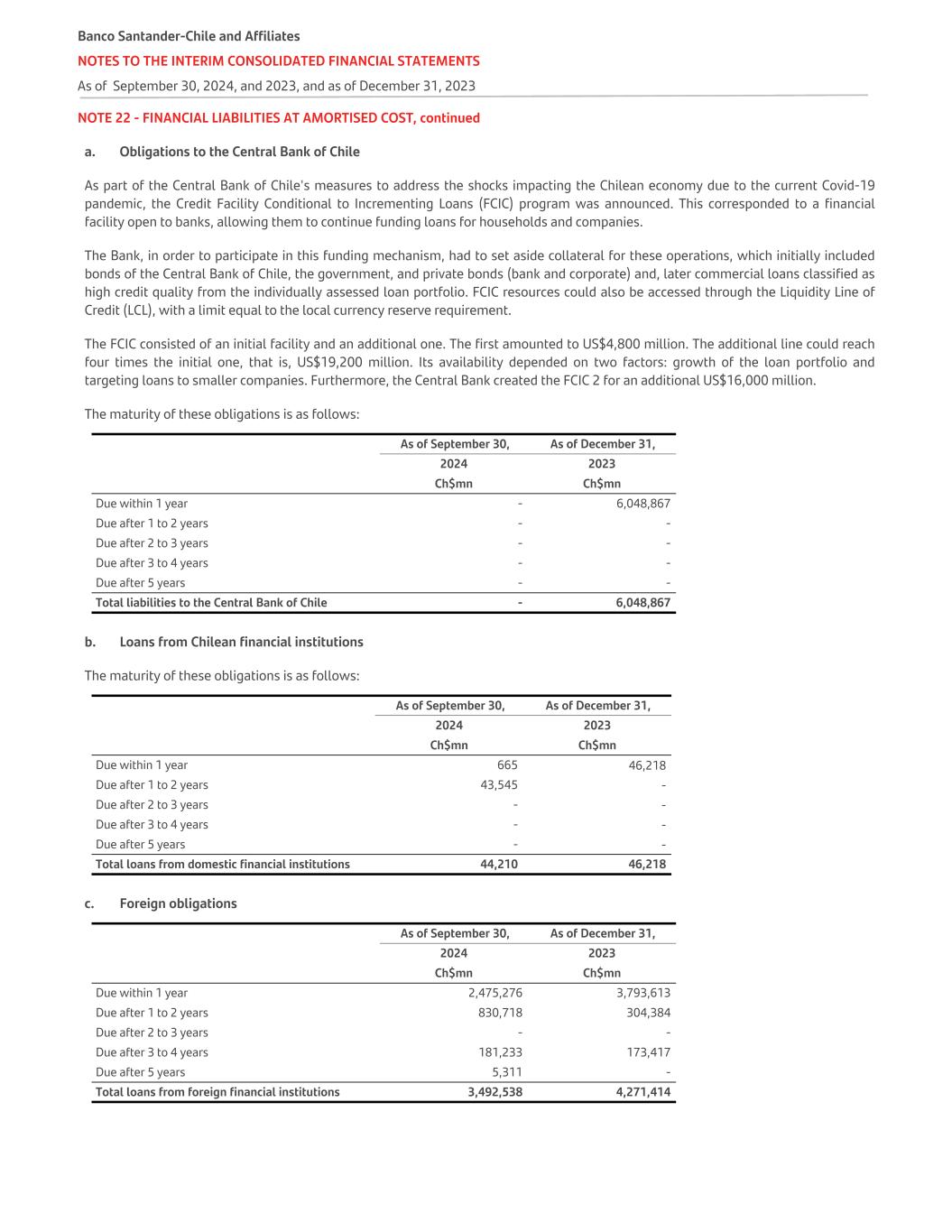 NOTE 22 - FINANCIAL LIABILITIES AT AMORTISED COST, continued a. Obligations to the Central Bank of Chile As part of the Central Bank of Chile's measures to address the shocks impacting the Chilean economy due to the current Covid-19 pandemic, the Credit Facility Conditional to Incrementing Loans (FCIC) program was announced. This corresponded to a financial facility open to banks, allowing them to continue funding loans for households and companies. The Bank, in order to participate in this funding mechanism, had to set aside collateral for these operations, which initially included bonds of the Central Bank of Chile, the government, and private bonds (bank and corporate) and, later commercial loans classified as high credit quality from the individually assessed loan portfolio. FCIC resources could also be accessed through the Liquidity Line of Credit (LCL), with a limit equal to the local currency reserve requirement. The FCIC consisted of an initial facility and an additional one. The first amounted to US$4,800 million. The additional line could reach four times the initial one, that is, US$19,200 million. Its availability depended on two factors: growth of the loan portfolio and targeting loans to smaller companies. Furthermore, the Central Bank created the FCIC 2 for an additional US$16,000 million. The maturity of these obligations is as follows:   As of September 30, As of December 31, 2024 2023   Ch$mn Ch$mn Due within 1 year - 6,048,867 Due after 1 to 2 years - - Due after 2 to 3 years - - Due after 3 to 4 years - - Due after 5 years - - Total liabilities to the Central Bank of Chile - 6,048,867 b. Loans from Chilean financial institutions The maturity of these obligations is as follows:   As of September 30, As of December 31, 2024 2023   Ch$mn Ch$mn Due within 1 year 665 46,218 Due after 1 to 2 years 43,545 - Due after 2 to 3 years - - Due after 3 to 4 years - - Due after 5 years - - Total loans from domestic financial institutions 44,210 46,218 c. Foreign obligations   As of September 30, As of December 31, 2024 2023   Ch$mn Ch$mn Due within 1 year 2,475,276 3,793,613 Due after 1 to 2 years 830,718 304,384 Due after 2 to 3 years - - Due after 3 to 4 years 181,233 173,417 Due after 5 years 5,311 - Total loans from foreign financial institutions 3,492,538 4,271,414 Banco Santander-Chile and Affiliates NOTES TO THE INTERIM CONSOLIDATED FINANCIAL STATEMENTS As of September 30, 2024, and 2023, and as of December 31, 2023