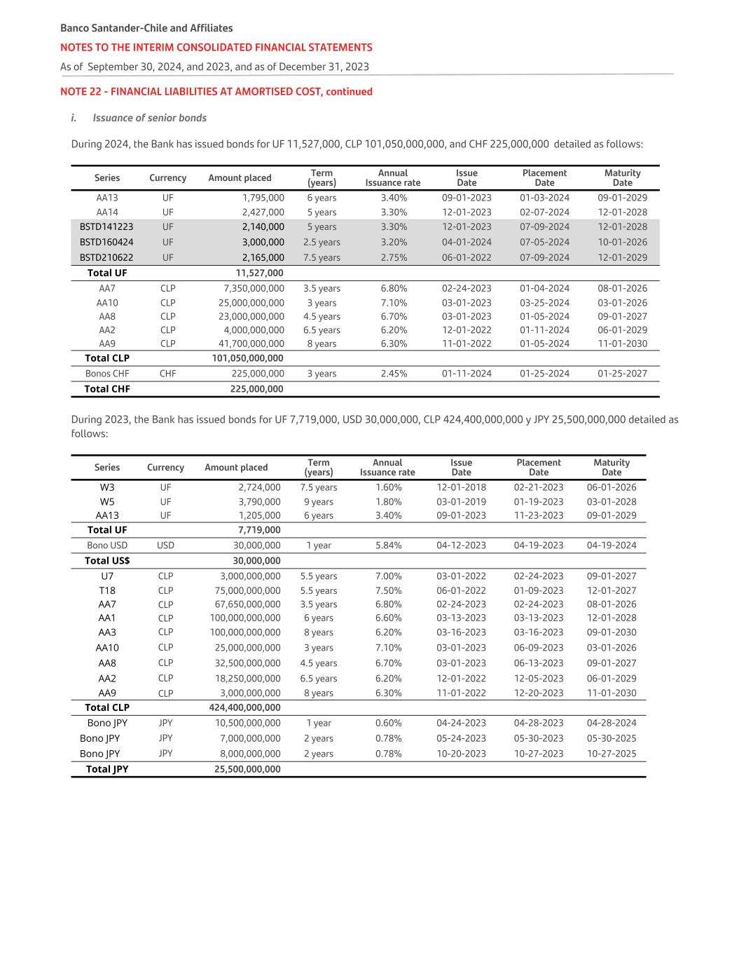 NOTE 22 - FINANCIAL LIABILITIES AT AMORTISED COST, continued i. Issuance of senior bonds During 2024, the Bank has issued bonds for UF 11,527,000, CLP 101,050,000,000, and CHF 225,000,000 detailed as follows: Series Currency Amount placed Term (years) Annual Issuance rate Issue Date Placement Date Maturity Date AA13 UF 1,795,000 6 years 3.40% 09-01-2023 01-03-2024 09-01-2029 AA14 UF 2,427,000 5 years 3.30% 12-01-2023 02-07-2024 12-01-2028 BSTD141223 UF 2,140,000 5 years 3.30% 12-01-2023 07-09-2024 12-01-2028 BSTD160424 UF 3,000,000 2.5 years 3.20% 04-01-2024 07-05-2024 10-01-2026 BSTD210622 UF 2,165,000 7.5 years 2.75% 06-01-2022 07-09-2024 12-01-2029 Total UF 11,527,000 AA7 CLP 7,350,000,000 3.5 years 6.80% 02-24-2023 01-04-2024 08-01-2026 AA10 CLP 25,000,000,000 3 years 7.10% 03-01-2023 03-25-2024 03-01-2026 AA8 CLP 23,000,000,000 4.5 years 6.70% 03-01-2023 01-05-2024 09-01-2027 AA2 CLP 4,000,000,000 6.5 years 6.20% 12-01-2022 01-11-2024 06-01-2029 AA9 CLP 41,700,000,000 8 years 6.30% 11-01-2022 01-05-2024 11-01-2030 Total CLP 101,050,000,000 Bonos CHF CHF 225,000,000 3 years 2.45% 01-11-2024 01-25-2024 01-25-2027 Total CHF 225,000,000 During 2023, the Bank has issued bonds for UF 7,719,000, USD 30,000,000, CLP 424,400,000,000 y JPY 25,500,000,000 detailed as follows: Series Currency Amount placed Term (years) Annual Issuance rate Issue Date Placement Date Maturity Date W3 UF 2,724,000 7.5 years 1.60% 12-01-2018 02-21-2023 06-01-2026 W5 UF 3,790,000 9 years 1.80% 03-01-2019 01-19-2023 03-01-2028 AA13 UF 1,205,000 6 years 3.40% 09-01-2023 11-23-2023 09-01-2029 Total UF 7,719,000 Bono USD USD 30,000,000 1 year 5.84% 04-12-2023 04-19-2023 04-19-2024 Total US$ 30,000,000 U7 CLP 3,000,000,000 5.5 years 7.00% 03-01-2022 02-24-2023 09-01-2027 T18 CLP 75,000,000,000 5.5 years 7.50% 06-01-2022 01-09-2023 12-01-2027 AA7 CLP 67,650,000,000 3.5 years 6.80% 02-24-2023 02-24-2023 08-01-2026 AA1 CLP 100,000,000,000 6 years 6.60% 03-13-2023 03-13-2023 12-01-2028 AA3 CLP 100,000,000,000 8 years 6.20% 03-16-2023 03-16-2023 09-01-2030 AA10 CLP 25,000,000,000 3 years 7.10% 03-01-2023 06-09-2023 03-01-2026 AA8 CLP 32,500,000,000 4.5 years 6.70% 03-01-2023 06-13-2023 09-01-2027 AA2 CLP 18,250,000,000 6.5 years 6.20% 12-01-2022 12-05-2023 06-01-2029 AA9 CLP 3,000,000,000 8 years 6.30% 11-01-2022 12-20-2023 11-01-2030 Total CLP 424,400,000,000 Bono JPY JPY 10,500,000,000 1 year 0.60% 04-24-2023 04-28-2023 04-28-2024 Bono JPY JPY 7,000,000,000 2 years 0.78% 05-24-2023 05-30-2023 05-30-2025 Bono JPY JPY 8,000,000,000 2 years 0.78% 10-20-2023 10-27-2023 10-27-2025 Total JPY 25,500,000,000 Banco Santander-Chile and Affiliates NOTES TO THE INTERIM CONSOLIDATED FINANCIAL STATEMENTS As of September 30, 2024, and 2023, and as of December 31, 2023