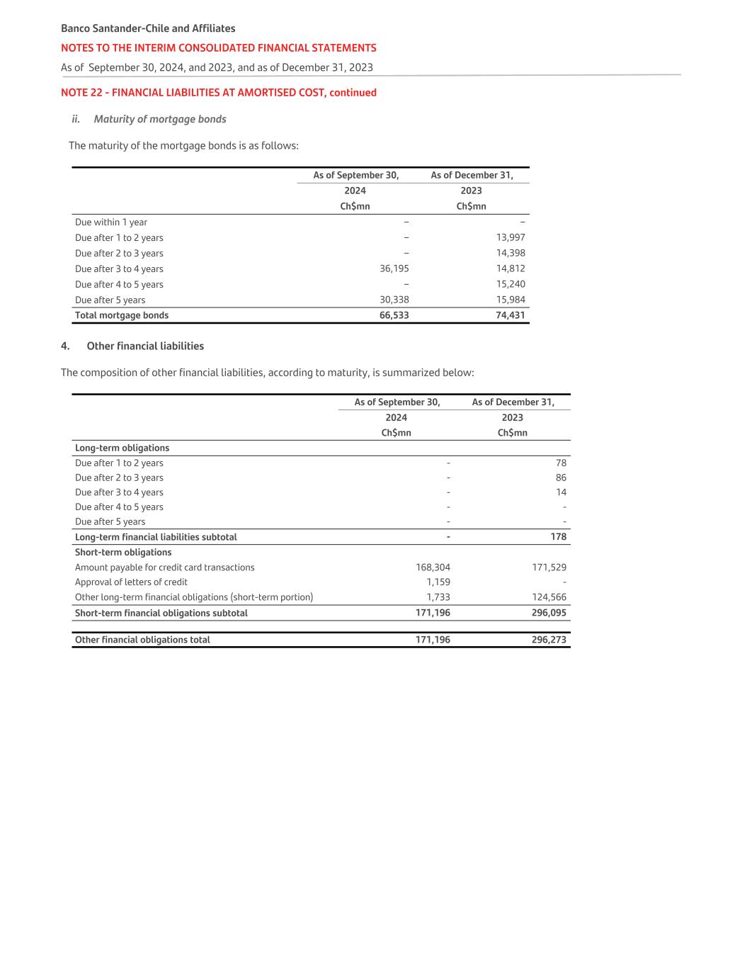 NOTE 22 - FINANCIAL LIABILITIES AT AMORTISED COST, continued ii. Maturity of mortgage bonds The maturity of the mortgage bonds is as follows: As of September 30, As of December 31,   2024 2023 Ch$mn Ch$mn Due within 1 year – – Due after 1 to 2 years – 13,997 Due after 2 to 3 years – 14,398 Due after 3 to 4 years 36,195 14,812 Due after 4 to 5 years – 15,240 Due after 5 years 30,338 15,984 Total mortgage bonds 66,533 74,431 4. Other financial liabilities The composition of other financial liabilities, according to maturity, is summarized below:   As of September 30, As of December 31, 2024 2023   Ch$mn Ch$mn Long-term obligations Due after 1 to 2 years - 78 Due after 2 to 3 years - 86 Due after 3 to 4 years - 14 Due after 4 to 5 years - - Due after 5 years - - Long-term financial liabilities subtotal - 178 Short-term obligations Amount payable for credit card transactions 168,304 171,529 Approval of letters of credit 1,159 - Other long-term financial obligations (short-term portion) 1,733 124,566 Short-term financial obligations subtotal 171,196 296,095 Other financial obligations total 171,196 296,273 Banco Santander-Chile and Affiliates NOTES TO THE INTERIM CONSOLIDATED FINANCIAL STATEMENTS As of September 30, 2024, and 2023, and as of December 31, 2023