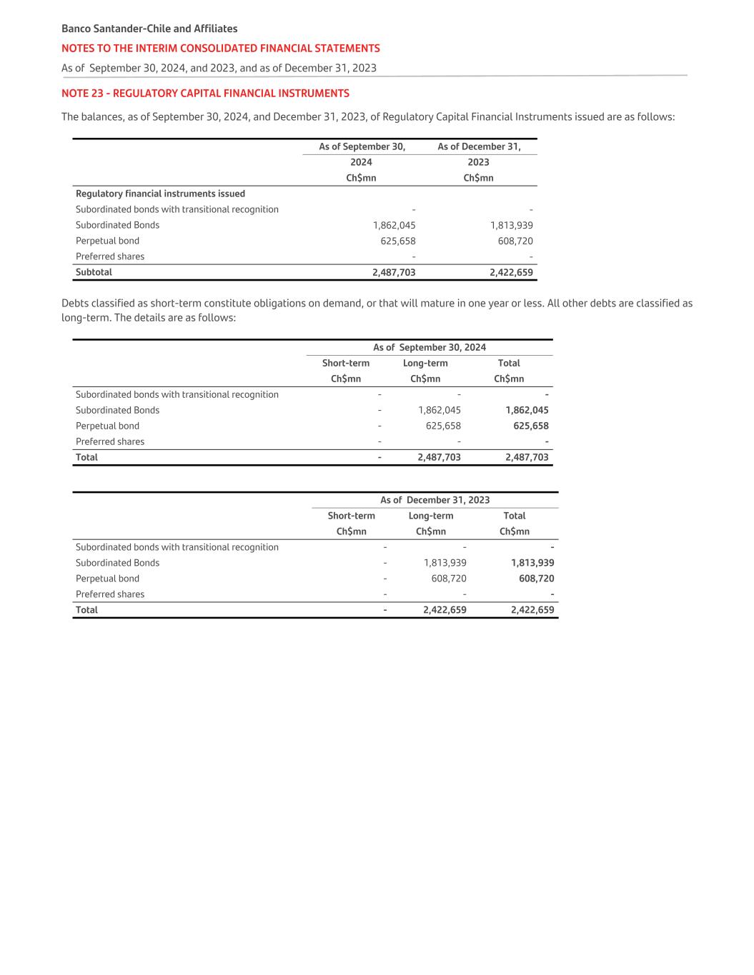 NOTE 23 - REGULATORY CAPITAL FINANCIAL INSTRUMENTS The balances, as of September 30, 2024, and December 31, 2023, of Regulatory Capital Financial Instruments issued are as follows:   As of September 30, As of December 31, 2024 2023   Ch$mn Ch$mn Regulatory financial instruments issued     Subordinated bonds with transitional recognition - - Subordinated Bonds 1,862,045 1,813,939 Perpetual bond 625,658 608,720 Preferred shares - - Subtotal 2,487,703 2,422,659 Debts classified as short-term constitute obligations on demand, or that will mature in one year or less. All other debts are classified as long-term. The details are as follows:   As of September 30, 2024 Short-term Long-term Total   Ch$mn Ch$mn Ch$mn Subordinated bonds with transitional recognition - - - Subordinated Bonds - 1,862,045 1,862,045 Perpetual bond - 625,658 625,658 Preferred shares - - - Total - 2,487,703 2,487,703   As of December 31, 2023 Short-term Long-term Total   Ch$mn Ch$mn Ch$mn Subordinated bonds with transitional recognition - - - Subordinated Bonds - 1,813,939 1,813,939 Perpetual bond - 608,720 608,720 Preferred shares - - - Total - 2,422,659 2,422,659 Banco Santander-Chile and Affiliates NOTES TO THE INTERIM CONSOLIDATED FINANCIAL STATEMENTS As of September 30, 2024, and 2023, and as of December 31, 2023