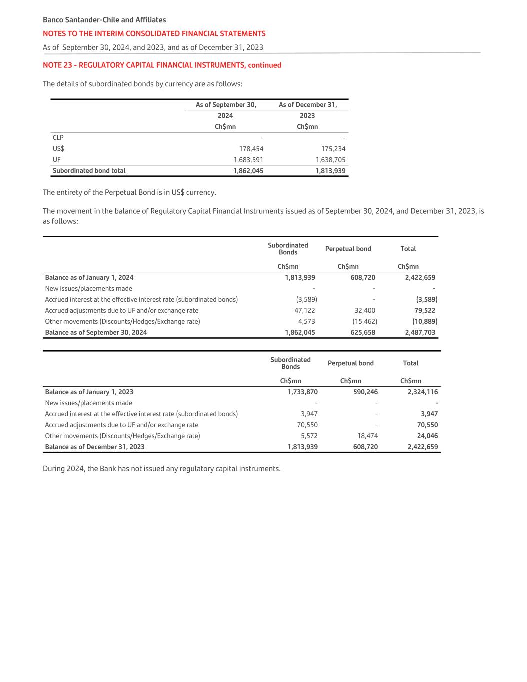 NOTE 23 - REGULATORY CAPITAL FINANCIAL INSTRUMENTS, continued The details of subordinated bonds by currency are as follows:   As of September 30, As of December 31, 2024 2023   Ch$mn Ch$mn CLP - - US$ 178,454 175,234 UF 1,683,591 1,638,705 Subordinated bond total 1,862,045 1,813,939 The entirety of the Perpetual Bond is in US$ currency. The movement in the balance of Regulatory Capital Financial Instruments issued as of September 30, 2024, and December 31, 2023, is as follows:   Subordinated Bonds Perpetual bond Total   Ch$mn Ch$mn Ch$mn Balance as of January 1, 2024 1,813,939 608,720 2,422,659 New issues/placements made - - - Accrued interest at the effective interest rate (subordinated bonds) (3,589) - (3,589) Accrued adjustments due to UF and/or exchange rate 47,122 32,400 79,522 Other movements (Discounts/Hedges/Exchange rate) 4,573 (15,462) (10,889) Balance as of September 30, 2024 1,862,045 625,658 2,487,703   Subordinated Bonds Perpetual bond Total   Ch$mn Ch$mn Ch$mn Balance as of January 1, 2023 1,733,870 590,246 2,324,116 New issues/placements made - - - Accrued interest at the effective interest rate (subordinated bonds) 3,947 - 3,947 Accrued adjustments due to UF and/or exchange rate 70,550 - 70,550 Other movements (Discounts/Hedges/Exchange rate) 5,572 18,474 24,046 Balance as of December 31, 2023 1,813,939 608,720 2,422,659 During 2024, the Bank has not issued any regulatory capital instruments. Banco Santander-Chile and Affiliates NOTES TO THE INTERIM CONSOLIDATED FINANCIAL STATEMENTS As of September 30, 2024, and 2023, and as of December 31, 2023