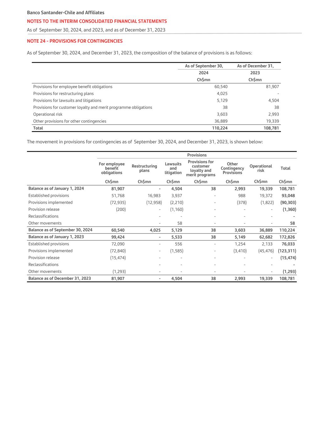 NOTE 24 - PROVISIONS FOR CONTINGENCIES As of September 30, 2024, and December 31, 2023, the composition of the balance of provisions is as follows: As of September 30, As of December 31, 2024 2023 Ch$mn Ch$mn Provisions for employee benefit obligations 60,540 81,907 Provisions for restructuring plans 4,025 - Provisions for lawsuits and litigations 5,129 4,504 Provisions for customer loyalty and merit programme obligations 38 38 Operational risk 3,603 2,993 Other provisions for other contingencies 36,889 19,339 Total 110,224 108,781 The movement in provisions for contingencies as of September 30, 2024, and December 31, 2023, is shown below:   Provisions For employee benefit obligations Restructuring plans Lawsuits and litigation Provisions for customer loyalty and merit programs Other Contingency Provisions Operational risk Total   Ch$mn Ch$mn Ch$mn Ch$mn Ch$mn Ch$mn Ch$mn Balance as of January 1, 2024 81,907 - 4,504 38 2,993 19,339 108,781 Established provisions 51,768 16,983 3,937 - 988 19,372 93,048 Provisions implemented (72,935) (12,958) (2,210) - (378) (1,822) (90,303) Provision release (200) - (1,160) - - - (1,360) Reclassifications - - - - - - Other movements - 58 - - - 58 Balance as of September 30, 2024 60,540 4,025 5,129 38 3,603 36,889 110,224 Balance as of January 1, 2023 99,424 - 5,533 38 5,149 62,682 172,826 Established provisions 72,090 - 556 - 1,254 2,133 76,033 Provisions implemented (72,840) - (1,585) - (3,410) (45,476) (123,311) Provision release (15,474) - - - - - (15,474) Reclassifications - - - - - - Other movements (1,293) - - - - - (1,293) Balance as of December 31, 2023 81,907 - 4,504 38 2,993 19,339 108,781 Banco Santander-Chile and Affiliates NOTES TO THE INTERIM CONSOLIDATED FINANCIAL STATEMENTS As of September 30, 2024, and 2023, and as of December 31, 2023
