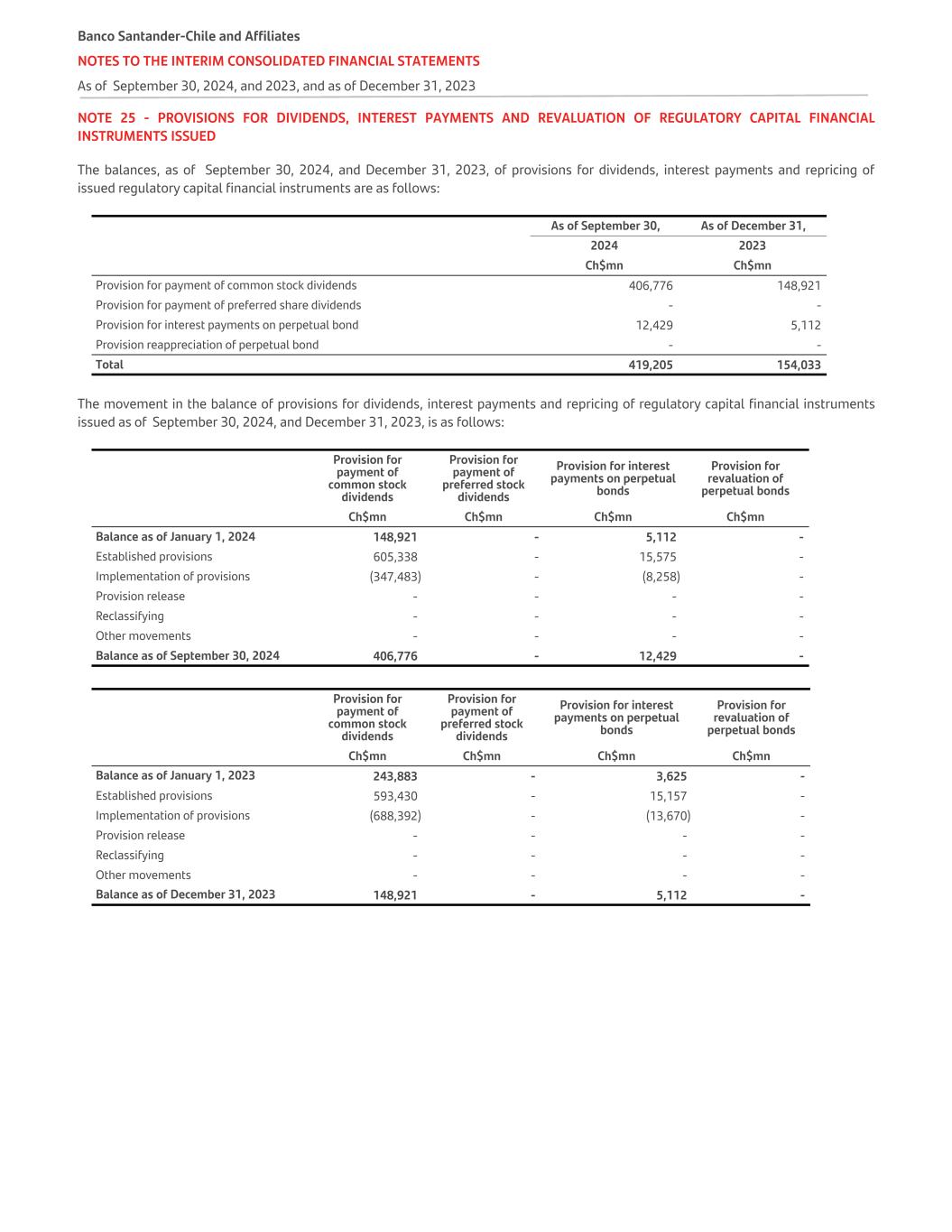 NOTE 25 - PROVISIONS FOR DIVIDENDS, INTEREST PAYMENTS AND REVALUATION OF REGULATORY CAPITAL FINANCIAL INSTRUMENTS ISSUED The balances, as of September 30, 2024, and December 31, 2023, of provisions for dividends, interest payments and repricing of issued regulatory capital financial instruments are as follows: As of September 30, As of December 31, 2024 2023 Ch$mn Ch$mn Provision for payment of common stock dividends 406,776 148,921 Provision for payment of preferred share dividends - - Provision for interest payments on perpetual bond 12,429 5,112 Provision reappreciation of perpetual bond - - Total 419,205 154,033 The movement in the balance of provisions for dividends, interest payments and repricing of regulatory capital financial instruments issued as of September 30, 2024, and December 31, 2023, is as follows: Provision for payment of common stock dividends Provision for payment of preferred stock dividends Provision for interest payments on perpetual bonds Provision for revaluation of perpetual bonds   Ch$mn Ch$mn Ch$mn Ch$mn Balance as of January 1, 2024 148,921 - 5,112 - Established provisions 605,338 - 15,575 - Implementation of provisions (347,483) - (8,258) - Provision release - - - - Reclassifying - - - - Other movements - - - - Balance as of September 30, 2024 406,776 - 12,429 - Provision for payment of common stock dividends Provision for payment of preferred stock dividends Provision for interest payments on perpetual bonds Provision for revaluation of perpetual bonds Ch$mn Ch$mn Ch$mn Ch$mn Balance as of January 1, 2023 243,883 - 3,625 - Established provisions 593,430 - 15,157 - Implementation of provisions (688,392) - (13,670) - Provision release - - - - Reclassifying - - - - Other movements - - - - Balance as of December 31, 2023 148,921 - 5,112 - Banco Santander-Chile and Affiliates NOTES TO THE INTERIM CONSOLIDATED FINANCIAL STATEMENTS As of September 30, 2024, and 2023, and as of December 31, 2023