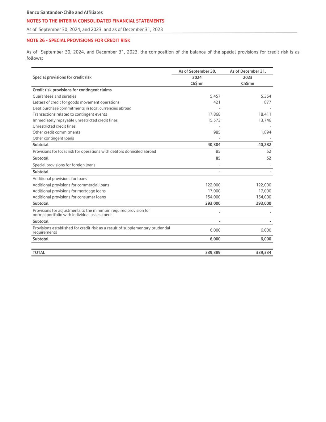NOTE 26 - SPECIAL PROVISIONS FOR CREDIT RISK As of September 30, 2024, and December 31, 2023, the composition of the balance of the special provisions for credit risk is as follows:   As of September 30, As of December 31, Special provisions for credit risk 2024 2023 Ch$mn Ch$mn Credit risk provisions for contingent claims Guarantees and sureties 5,457 5,354 Letters of credit for goods movement operations 421 877 Debt purchase commitments in local currencies abroad - - Transactions related to contingent events 17,868 18,411 Immediately repayable unrestricted credit lines 15,573 13,746 Unrestricted credit lines - - Other credit commitments 985 1,894 Other contingent loans - - Subtotal 40,304 40,282 Provisions for local risk for operations with debtors domiciled abroad 85 52 Subtotal 85 52 Special provisions for foreign loans - - Subtotal - - Additional provisions for loans Additional provisions for commercial loans 122,000 122,000 Additional provisions for mortgage loans 17,000 17,000 Additional provisions for consumer loans 154,000 154,000 Subtotal 293,000 293,000 Provisions for adjustments to the minimum required provision for normal portfolio with individual assessment - - Subtotal - - Provisions established for credit risk as a result of supplementary prudential requirements 6,000 6,000 Subtotal 6,000 6,000 TOTAL 339,389 339,334 Banco Santander-Chile and Affiliates NOTES TO THE INTERIM CONSOLIDATED FINANCIAL STATEMENTS As of September 30, 2024, and 2023, and as of December 31, 2023