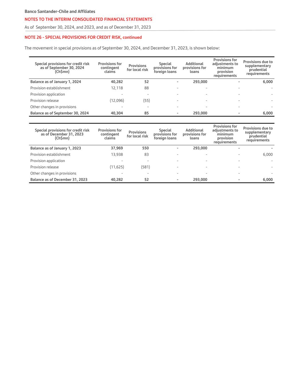 NOTE 26 - SPECIAL PROVISIONS FOR CREDIT RISK, continued The movement in special provisions as of September 30, 2024, and December 31, 2023, is shown below: Special provisions for credit risk as of September 30, 2024 (Ch$mn) Provisions for contingent claims Provisions for local risk Special provisions for foreign loans Additional provisions for loans Provisions for adjustments to minimum provision requirements Provisions due to supplementary prudential requirements Balance as of January 1, 2024 40,282 52 - 293,000 - 6,000 Provision establishment 12,118 88 - - - - Provision application - - - - - - Provision release (12,096) (55) - - - - Other changes in provisions - - - - - - Balance as of September 30, 2024 40,304 85 - 293,000 - 6,000 Special provisions for credit risk as of December 31, 2023 (Ch$mn) Provisions for contingent claims Provisions for local risk Special provisions for foreign loans Additional provisions for loans Provisions for adjustments to minimum provision requirements Provisions due to supplementary prudential requirements Balance as of January 1, 2023 37,969 550 - 293,000 - - Provision establishment 13,938 83 - - - 6,000 Provision application - - - - - - Provision release (11,625) (581) - - - - Other changes in provisions - - - - - - Balance as of December 31, 2023 40,282 52 - 293,000 - 6,000 Banco Santander-Chile and Affiliates NOTES TO THE INTERIM CONSOLIDATED FINANCIAL STATEMENTS As of September 30, 2024, and 2023, and as of December 31, 2023