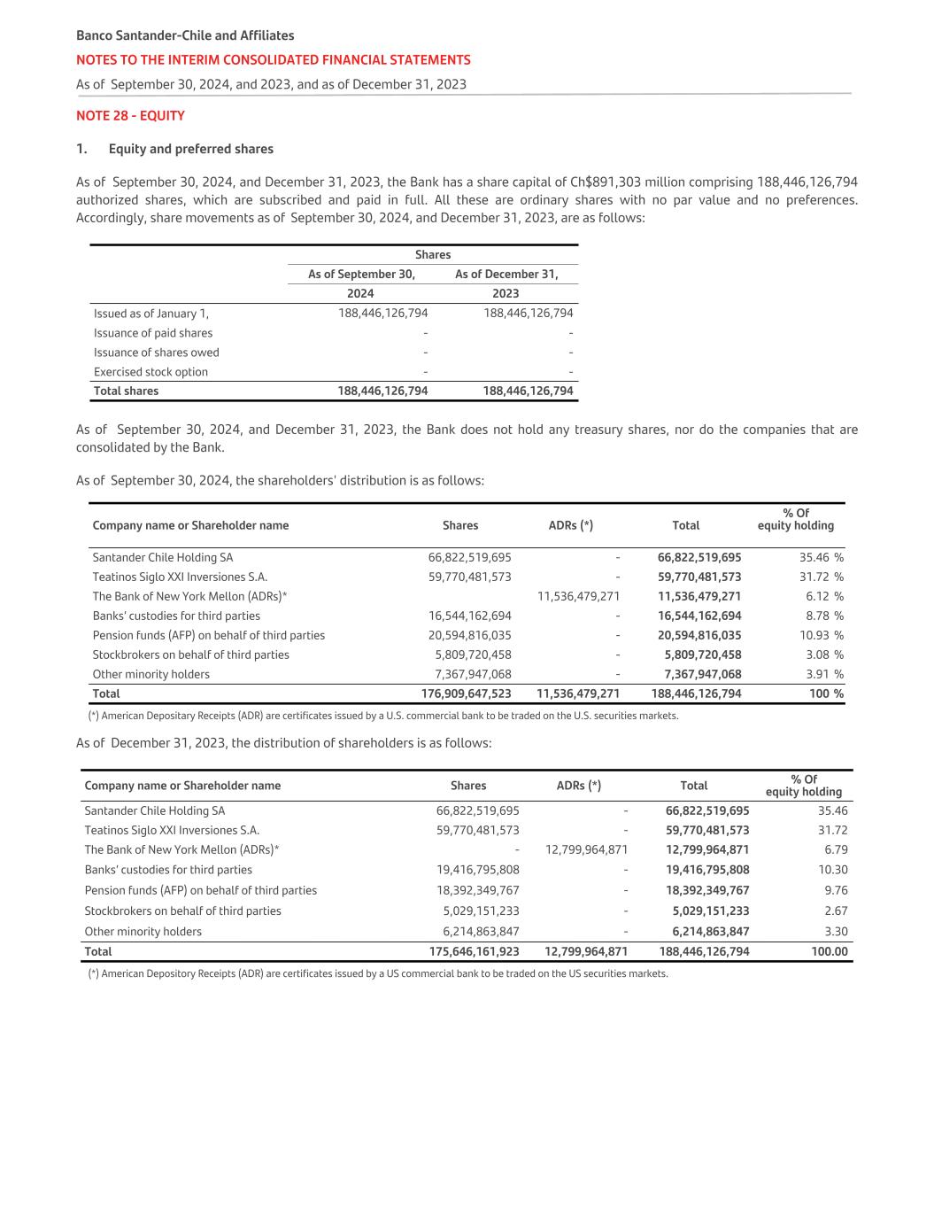 NOTE 28 - EQUITY 1. Equity and preferred shares As of September 30, 2024, and December 31, 2023, the Bank has a share capital of Ch$891,303 million comprising 188,446,126,794 authorized shares, which are subscribed and paid in full. All these are ordinary shares with no par value and no preferences. Accordingly, share movements as of September 30, 2024, and December 31, 2023, are as follows: Shares As of September 30, As of December 31, 2024 2023 Issued as of January 1, 188,446,126,794 188,446,126,794 Issuance of paid shares - - Issuance of shares owed - - Exercised stock option - - Total shares 188,446,126,794 188,446,126,794 As of September 30, 2024, and December 31, 2023, the Bank does not hold any treasury shares, nor do the companies that are consolidated by the Bank. As of September 30, 2024, the shareholders' distribution is as follows: Company name or Shareholder name Shares ADRs (*) Total % Of equity holding Santander Chile Holding SA 66,822,519,695 - 66,822,519,695 35.46 % Teatinos Siglo XXI Inversiones S.A. 59,770,481,573 - 59,770,481,573 31.72 % The Bank of New York Mellon (ADRs)* 11,536,479,271 11,536,479,271 6.12 % Banks’ custodies for third parties 16,544,162,694 - 16,544,162,694 8.78 % Pension funds (AFP) on behalf of third parties 20,594,816,035 - 20,594,816,035 10.93 % Stockbrokers on behalf of third parties 5,809,720,458 - 5,809,720,458 3.08 % Other minority holders 7,367,947,068 - 7,367,947,068 3.91 % Total 176,909,647,523 11,536,479,271 188,446,126,794 100 % (*) American Depositary Receipts (ADR) are certificates issued by a U.S. commercial bank to be traded on the U.S. securities markets. As of December 31, 2023, the distribution of shareholders is as follows: Company name or Shareholder name Shares ADRs (*) Total % Of equity holding Santander Chile Holding SA 66,822,519,695 - 66,822,519,695 35.46 Teatinos Siglo XXI Inversiones S.A. 59,770,481,573 - 59,770,481,573 31.72 The Bank of New York Mellon (ADRs)* - 12,799,964,871 12,799,964,871 6.79 Banks’ custodies for third parties 19,416,795,808 - 19,416,795,808 10.30 Pension funds (AFP) on behalf of third parties 18,392,349,767 - 18,392,349,767 9.76 Stockbrokers on behalf of third parties 5,029,151,233 - 5,029,151,233 2.67 Other minority holders 6,214,863,847 - 6,214,863,847 3.30 Total 175,646,161,923 12,799,964,871 188,446,126,794 100.00 (*) American Depository Receipts (ADR) are certificates issued by a US commercial bank to be traded on the US securities markets. Banco Santander-Chile and Affiliates NOTES TO THE INTERIM CONSOLIDATED FINANCIAL STATEMENTS As of September 30, 2024, and 2023, and as of December 31, 2023