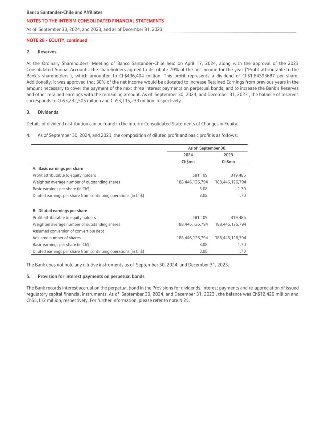NOTE 28 - EQUITY, continued 2. Reserves At the Ordinary Shareholders' Meeting of Banco Santander-Chile held on April 17, 2024, along with the approval of the 2023 Consolidated Annual Accounts, the shareholders agreed to distribute 70% of the net income for the year ("Profit attributable to the Bank's shareholders"), which amounted to Ch$496,404 million. This profit represents a dividend of Ch$1.84393687 per share. Additionally, it was approved that 30% of the net income would be allocated to increase Retained Earnings from previous years in the amount necessary to cover the payment of the next three interest payments on perpetual bonds, and to increase the Bank's Reserves and other retained earnings with the remaining amount. As of September 30, 2024, and December 31, 2023 , the balance of reserves corresponds to Ch$3,232,505 million and Ch$3,115,239 million, respectively. 3. Dividends Details of dividend distribution can be found in the Interim Consolidated Statements of Changes in Equity. 4. As of September 30, 2024, and 2023, the composition of diluted profit and basic profit is as follows:   As of September 30,   2024 2023   Ch$mn Ch$mn A. Basic earnings per share Profit attributable to equity holders 581,109 319,486 Weighted average number of outstanding shares 188,446,126,794 188,446,126,794 Basic earnings per share (in Ch$) 3.08 1.70 Diluted earnings per share from continuing operations (in Ch$) 3.08 1.70 B. Diluted earnings per share Profit attributable to equity holders 581,109 319,486 Weighted average number of outstanding shares 188,446,126,794 188,446,126,794 Assumed conversion of convertible debt - - Adjusted number of shares 188,446,126,794 188,446,126,794 Basic earnings per share (in Ch$) 3.08 1.70 Diluted earnings per share from continuing operations (in Ch$) 3.08 1.70 The Bank does not hold any dilutive instruments as of September 30, 2024, and December 31, 2023. 5. Provision for interest payments on perpetual bonds The Bank records interest accrual on the perpetual bond in the Provisions for dividends, interest payments and re-appreciation of issued regulatory capital financial instruments. As of September 30, 2024, and December 31, 2023 , the balance was Ch$12,429 million and Ch$5,112 million, respectively. For further information, please refer to note N 25. Banco Santander-Chile and Affiliates NOTES TO THE INTERIM CONSOLIDATED FINANCIAL STATEMENTS As of September 30, 2024, and 2023, and as of December 31, 2023