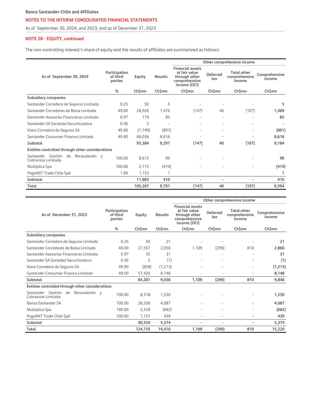 NOTE 28 - EQUITY, continued The non-controlling interest's share of equity and the results of affiliates are summarized as follows: Other comprehensive income As of September 30, 2024 Participation of third parties Equity Results Financial assets at fair value through other comprehensive income (OCI) Deferred tax Total other comprehensive income Comprehensive income % Ch$mn Ch$mn Ch$mn Ch$mn Ch$mn Ch$mn Subsidiary companies Santander Corredora de Seguros Limitada 0.25 50 5 - - - 5 Santander Corredores de Bolsa Limitada 49.00 28,926 1,476 (147) 40 (107) 1,369 Santander Asesorías Financieras Limitada 0.97 119 85 - - - 85 Santander SA Sociedad Securitizadora 0.36 2 - - - - - Klare Corredora de Seguros SA 49.90 (1,749) (891) - - - (891) Santander Consumer Finance Limitada 49.90 66,036 8,616 - - - 8,616 Subtotal 93,384 9,291 (147) 40 (107) 9,184 Entities controlled through other considerations Santander Gestión de Recaudación y Cobranzas Limitada 100.00 8,615 96 - - - 96 Multiplica Spa 100.00 2,115 (414) - - - (414) PagoNXT Trade Chile SpA 1.00 1,153 1 1 Subtotal 11,883 410 - - - 410 Total 105,267 9,701 (147) 40 (107) 9,594 Other comprehensive income As of December 31, 2023 Participation of third parties Equity Results Financial assets at fair value through other comprehensive income (OCI) Deferred tax Total other comprehensive income Comprehensive income % Ch$mn Ch$mn Ch$mn Ch$mn Ch$mn Ch$mn Subsidiary companies Santander Corredora de Seguros Limitada 0.25 45 21 - - - 21 Santander Corredores de Bolsa Limitada 49.00 27,557 2,050 1,109 (299) 810 2,860 Santander Asesorías Financieras Limitada 0.97 35 31 - - - 31 Santander SA Sociedad Securitizadora 0.36 2 (1) - - - (1) Klare Corredora de Seguros SA 49.90 (858) (1,213) - - - (1,213) Santander Consumer Finance Limitada 49.00 57,420 8,148 - - - 8,148 Subtotal 84,201 9,036 1,109 (299) 810 9,846 Entities controlled through other considerations Santander Gestión de Recaudación y Cobranzas Limitada 100.00 8,518 1,530 - - - 1,530 Bansa Santander SA 100.00 28,336 4,087 - - - 4,087 Multiplica Spa 100.00 2,529 (682) - - - (682) PagoNXT Trade Chile SpA 100.00 1,151 439 - - - 439 Subtotal 40,534 5,374 - - - 5,374 Total 124,735 14,410 1,109 (299) 810 15,220 Banco Santander-Chile and Affiliates NOTES TO THE INTERIM CONSOLIDATED FINANCIAL STATEMENTS As of September 30, 2024, and 2023, and as of December 31, 2023