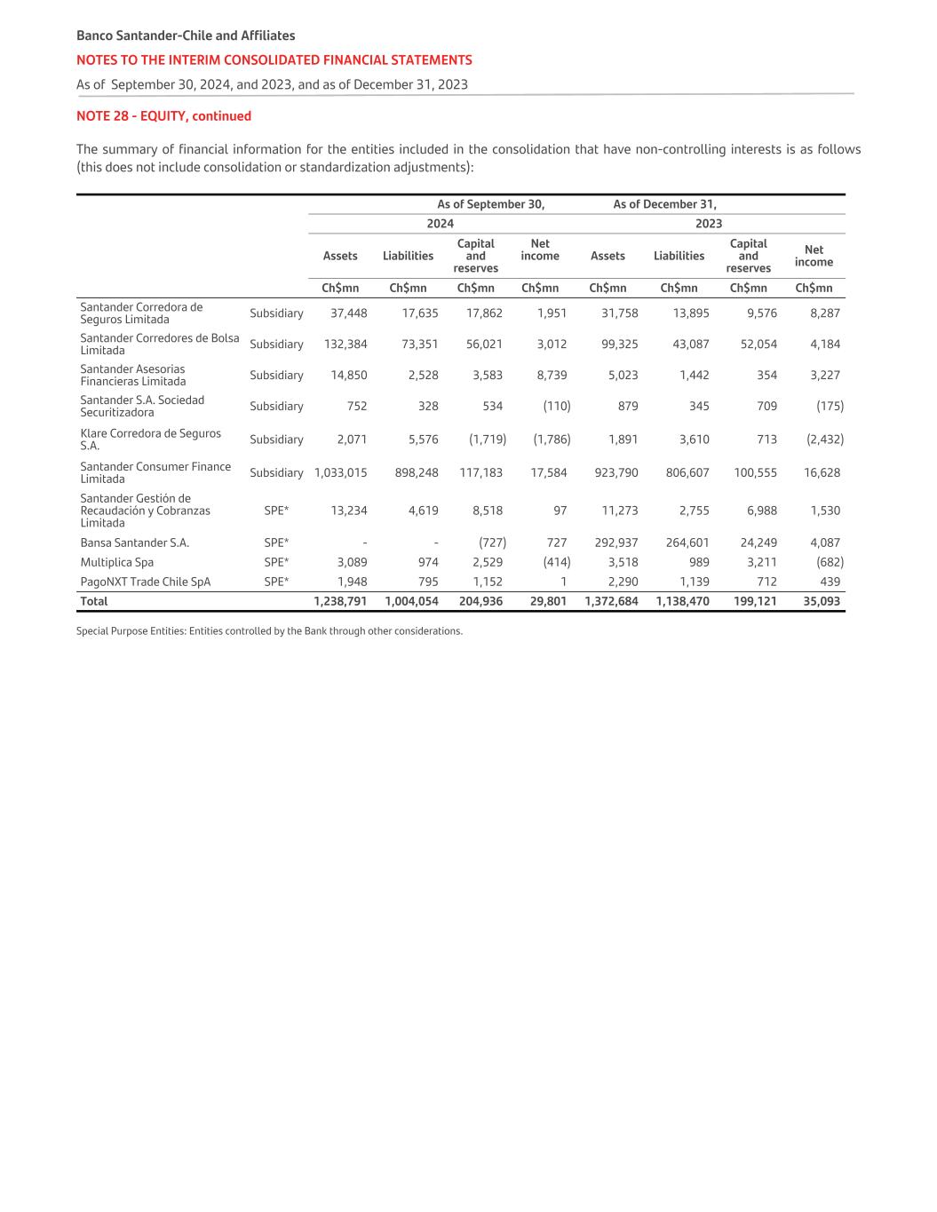NOTE 28 - EQUITY, continued The summary of financial information for the entities included in the consolidation that have non-controlling interests is as follows (this does not include consolidation or standardization adjustments):   As of September 30, As of December 31, 2024 2023 Assets Liabilities Capital and reserves Net income Assets Liabilities Capital and reserves Net income   Ch$mn Ch$mn Ch$mn Ch$mn Ch$mn Ch$mn Ch$mn Ch$mn Santander Corredora de Seguros Limitada Subsidiary 37,448 17,635 17,862 1,951 31,758 13,895 9,576 8,287 Santander Corredores de Bolsa Limitada Subsidiary 132,384 73,351 56,021 3,012 99,325 43,087 52,054 4,184 Santander Asesorias Financieras Limitada Subsidiary 14,850 2,528 3,583 8,739 5,023 1,442 354 3,227 Santander S.A. Sociedad Securitizadora Subsidiary 752 328 534 (110) 879 345 709 (175) Klare Corredora de Seguros S.A. Subsidiary 2,071 5,576 (1,719) (1,786) 1,891 3,610 713 (2,432) Santander Consumer Finance Limitada Subsidiary 1,033,015 898,248 117,183 17,584 923,790 806,607 100,555 16,628 Santander Gestión de Recaudación y Cobranzas Limitada SPE* 13,234 4,619 8,518 97 11,273 2,755 6,988 1,530 Bansa Santander S.A. SPE* - - (727) 727 292,937 264,601 24,249 4,087 Multiplica Spa SPE* 3,089 974 2,529 (414) 3,518 989 3,211 (682) PagoNXT Trade Chile SpA SPE* 1,948 795 1,152 1 2,290 1,139 712 439 Total 1,238,791 1,004,054 204,936 29,801 1,372,684 1,138,470 199,121 35,093 Special Purpose Entities: Entities controlled by the Bank through other considerations. Banco Santander-Chile and Affiliates NOTES TO THE INTERIM CONSOLIDATED FINANCIAL STATEMENTS As of September 30, 2024, and 2023, and as of December 31, 2023