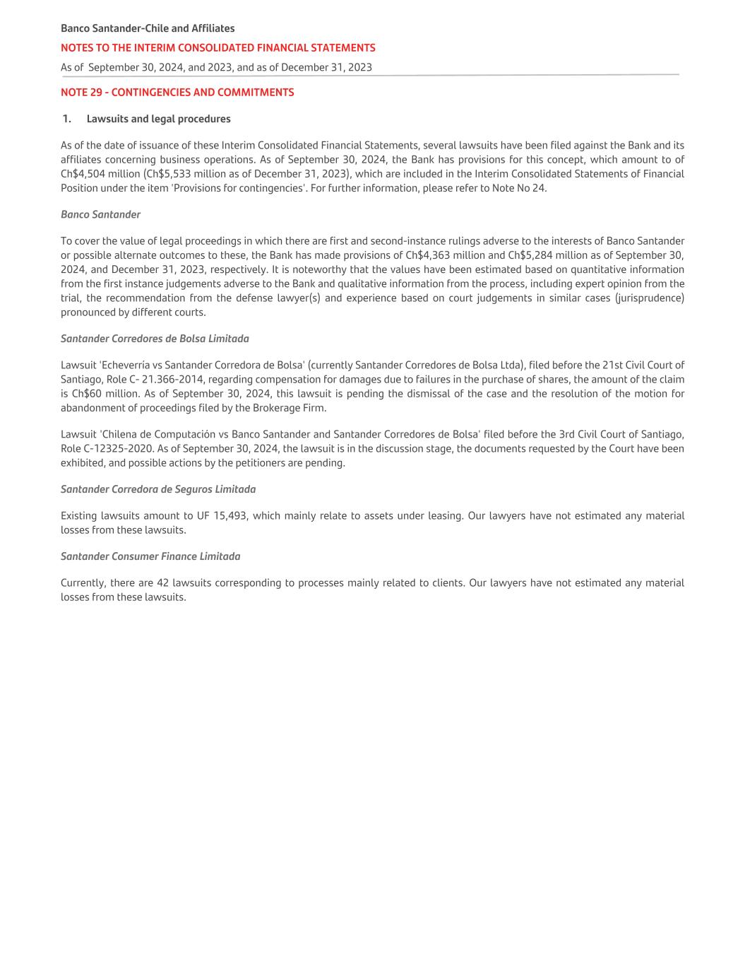NOTE 29 - CONTINGENCIES AND COMMITMENTS 1. Lawsuits and legal procedures As of the date of issuance of these Interim Consolidated Financial Statements, several lawsuits have been filed against the Bank and its affiliates concerning business operations. As of September 30, 2024, the Bank has provisions for this concept, which amount to of Ch$4,504 million (Ch$5,533 million as of December 31, 2023), which are included in the Interim Consolidated Statements of Financial Position under the item 'Provisions for contingencies'. For further information, please refer to Note No 24. Banco Santander To cover the value of legal proceedings in which there are first and second-instance rulings adverse to the interests of Banco Santander or possible alternate outcomes to these, the Bank has made provisions of Ch$4,363 million and Ch$5,284 million as of September 30, 2024, and December 31, 2023, respectively. It is noteworthy that the values have been estimated based on quantitative information from the first instance judgements adverse to the Bank and qualitative information from the process, including expert opinion from the trial, the recommendation from the defense lawyer(s) and experience based on court judgements in similar cases (jurisprudence) pronounced by different courts. Santander Corredores de Bolsa Limitada Lawsuit 'Echeverría vs Santander Corredora de Bolsa' (currently Santander Corredores de Bolsa Ltda), filed before the 21st Civil Court of Santiago, Role C- 21.366-2014, regarding compensation for damages due to failures in the purchase of shares, the amount of the claim is Ch$60 million. As of September 30, 2024, this lawsuit is pending the dismissal of the case and the resolution of the motion for abandonment of proceedings filed by the Brokerage Firm. Lawsuit 'Chilena de Computación vs Banco Santander and Santander Corredores de Bolsa' filed before the 3rd Civil Court of Santiago, Role C-12325-2020. As of September 30, 2024, the lawsuit is in the discussion stage, the documents requested by the Court have been exhibited, and possible actions by the petitioners are pending. Santander Corredora de Seguros Limitada Existing lawsuits amount to UF 15,493, which mainly relate to assets under leasing. Our lawyers have not estimated any material losses from these lawsuits. Santander Consumer Finance Limitada Currently, there are 42 lawsuits corresponding to processes mainly related to clients. Our lawyers have not estimated any material losses from these lawsuits. Banco Santander-Chile and Affiliates NOTES TO THE INTERIM CONSOLIDATED FINANCIAL STATEMENTS As of September 30, 2024, and 2023, and as of December 31, 2023