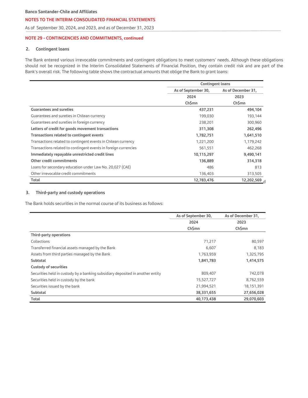 NOTE 29 - CONTINGENCIES AND COMMITMENTS, continued 2. Contingent loans The Bank entered various irrevocable commitments and contingent obligations to meet customers' needs. Although these obligations should not be recognized in the Interim Consolidated Statements of Financial Position, they contain credit risk and are part of the Bank's overall risk. The following table shows the contractual amounts that oblige the Bank to grant loans: d   Contingent loans As of September 30, As of December 31, 2024 2023   Ch$mn Ch$mn Guarantees and sureties 437,231 494,104 Guarantees and sureties in Chilean currency 199,030 193,144 Guarantees and sureties in foreign currency 238,201 300,960 Letters of credit for goods movement transactions 311,308 262,496 Transactions related to contingent events 1,782,751 1,641,510 Transactions related to contingent events in Chilean currency 1,221,200 1,179,242 Transactions related to contingent events in foreign currencies 561,551 462,268 Immediately repayable unrestricted credit lines 10,115,297 9,490,141 Other credit commitments 136,889 314,318 Loans for secondary education under Law No. 20,027 (CAE) 486 813 Other irrevocable credit commitments 136,403 313,505 Total 12,783,476 12,202,569 3. Third-party and custody operations The Bank holds securities in the normal course of its business as follows:   As of September 30, As of December 31, 2024 2023   Ch$mn Ch$mn Third-party operations Collections 71,217 80,597 Transferred financial assets managed by the Bank 6,607 8,183 Assets from third parties managed by the Bank 1,763,959 1,325,795 Subtotal 1,841,783 1,414,575 Custody of securities Securities held in custody by a banking subsidiary deposited in another entity 809,407 742,078 Securities held in custody by the bank 15,527,727 8,762,559 Securities issued by the bank 21,994,521 18,151,391 Subtotal 38,331,655 27,656,028 Total 40,173,438 29,070,603 Banco Santander-Chile and Affiliates NOTES TO THE INTERIM CONSOLIDATED FINANCIAL STATEMENTS As of September 30, 2024, and 2023, and as of December 31, 2023