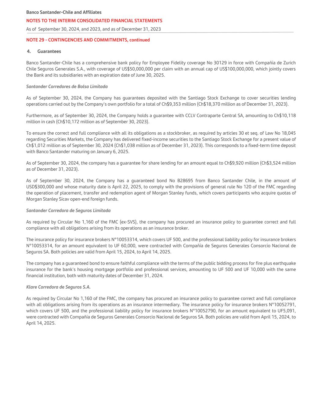 NOTE 29 - CONTINGENCIES AND COMMITMENTS, continued 4. Guarantees Banco Santander-Chile has a comprehensive bank policy for Employee Fidelity coverage No 30129 in force with Compañía de Zurich Chile Seguros Generales S.A., with coverage of US$50,000,000 per claim with an annual cap of US$100,000,000, which jointly covers the Bank and its subsidiaries with an expiration date of June 30, 2025. Santander Corredores de Bolsa Limitada As of September 30, 2024, the Company has guarantees deposited with the Santiago Stock Exchange to cover securities lending operations carried out by the Company's own portfolio for a total of Ch$9,353 million (Ch$18,370 million as of December 31, 2023). Furthermore, as of September 30, 2024, the Company holds a guarantee with CCLV Contraparte Central SA, amounting to Ch$10,118 million in cash (Ch$10,172 million as of September 30, 2023). To ensure the correct and full compliance with all its obligations as a stockbroker, as required by articles 30 et seq. of Law No 18,045 regarding Securities Markets, the Company has delivered fixed-income securities to the Santiago Stock Exchange for a present value of Ch$1,012 million as of September 30, 2024 (Ch$1,038 million as of December 31, 2023). This corresponds to a fixed-term time deposit with Banco Santander maturing on January 6, 2025. As of September 30, 2024, the company has a guarantee for share lending for an amount equal to Ch$9,920 million (Ch$3,524 million as of December 31, 2023). As of September 30, 2024, the Company has a guaranteed bond No B28695 from Banco Santander Chile, in the amount of USD$300,000 and whose maturity date is April 22, 2025, to comply with the provisions of general rule No 120 of the FMC regarding the operation of placement, transfer and redemption agent of Morgan Stanley funds, which covers participants who acquire quotas of Morgan Stanley Sicav open-end foreign funds. Santander Corredora de Seguros Limitada As required by Circular No 1,160 of the FMC (ex-SVS), the company has procured an insurance policy to guarantee correct and full compliance with all obligations arising from its operations as an insurance broker. The insurance policy for insurance brokers N°10053314, which covers UF 500, and the professional liability policy for insurance brokers N°10053314, for an amount equivalent to UF 60,000, were contracted with Compañía de Seguros Generales Consorcio Nacional de Seguros SA. Both policies are valid from April 15, 2024, to April 14, 2025. The company has a guaranteed bond to ensure faithful compliance with the terms of the public bidding process for fire plus earthquake insurance for the bank's housing mortgage portfolio and professional services, amounting to UF 500 and UF 10,000 with the same financial institution, both with maturity dates of December 31, 2024. Klare Corredora de Seguros S.A. As required by Circular No 1,160 of the FMC, the company has procured an insurance policy to guarantee correct and full compliance with all obligations arising from its operations as an insurance intermediary. The insurance policy for insurance brokers N°10052791, which covers UF 500, and the professional liability policy for insurance brokers N°10052790, for an amount equivalent to UF5,091, were contracted with Compañía de Seguros Generales Consorcio Nacional de Seguros SA. Both policies are valid from April 15, 2024, to April 14, 2025. Banco Santander-Chile and Affiliates NOTES TO THE INTERIM CONSOLIDATED FINANCIAL STATEMENTS As of September 30, 2024, and 2023, and as of December 31, 2023