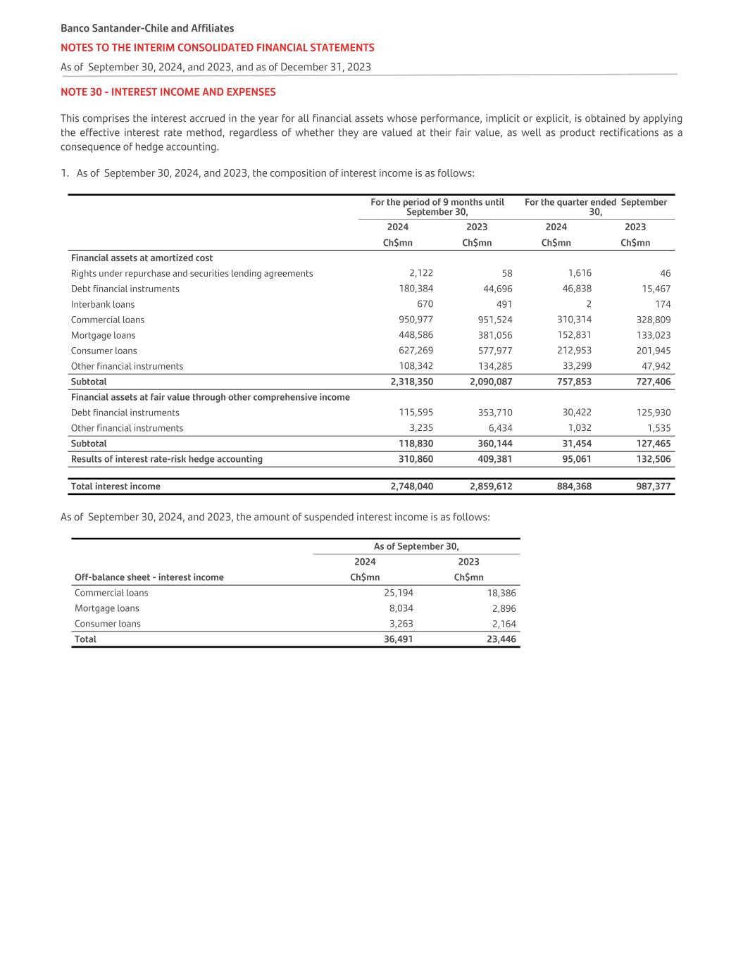 NOTE 30 - INTEREST INCOME AND EXPENSES This comprises the interest accrued in the year for all financial assets whose performance, implicit or explicit, is obtained by applying the effective interest rate method, regardless of whether they are valued at their fair value, as well as product rectifications as a consequence of hedge accounting. 1. As of September 30, 2024, and 2023, the composition of interest income is as follows: For the period of 9 months until September 30, For the quarter ended September 30,   2024 2023 2024 2023   Ch$mn Ch$mn Ch$mn Ch$mn Financial assets at amortized cost Rights under repurchase and securities lending agreements 2,122 58 1,616 46 Debt financial instruments 180,384 44,696 46,838 15,467 Interbank loans 670 491 2 174 Commercial loans 950,977 951,524 310,314 328,809 Mortgage loans 448,586 381,056 152,831 133,023 Consumer loans 627,269 577,977 212,953 201,945 Other financial instruments 108,342 134,285 33,299 47,942 Subtotal 2,318,350 2,090,087 757,853 727,406 Financial assets at fair value through other comprehensive income Debt financial instruments 115,595 353,710 30,422 125,930 Other financial instruments 3,235 6,434 1,032 1,535 Subtotal 118,830 360,144 31,454 127,465 Results of interest rate-risk hedge accounting 310,860 409,381 95,061 132,506 Total interest income 2,748,040 2,859,612 884,368 987,377 As of September 30, 2024, and 2023, the amount of suspended interest income is as follows: As of September 30, 2024 2023 Off-balance sheet - interest income Ch$mn Ch$mn Commercial loans 25,194 18,386 Mortgage loans 8,034 2,896 Consumer loans 3,263 2,164 Total 36,491 23,446 Banco Santander-Chile and Affiliates NOTES TO THE INTERIM CONSOLIDATED FINANCIAL STATEMENTS As of September 30, 2024, and 2023, and as of December 31, 2023