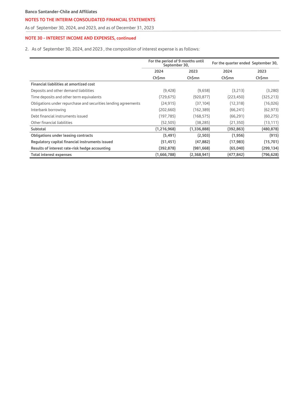 NOTE 30 - INTEREST INCOME AND EXPENSES, continued 2. As of September 30, 2024, and 2023 , the composition of interest expense is as follows: For the period of 9 months until September 30, For the quarter ended September 30,   2024 2023 2024 2023   Ch$mn Ch$mn Ch$mn Ch$mn Financial liabilities at amortized cost   Deposits and other demand liabilities (9,428) (9,658) (3,213) (3,280) Time deposits and other term equivalents (729,675) (920,877) (223,450) (325,213) Obligations under repurchase and securities lending agreements (24,915) (37,104) (12,318) (16,026) Interbank borrowing (202,660) (162,389) (66,241) (62,973) Debt financial instruments issued (197,785) (168,575) (66,291) (60,275) Other financial liabilities (52,505) (38,285) (21,350) (13,111) Subtotal (1,216,968) (1,336,888) (392,863) (480,878) Obligations under leasing contracts (5,491) (2,503) (1,956) (915) Regulatory capital financial instruments issued (51,451) (47,882) (17,983) (15,701) Results of interest rate-risk hedge accounting (392,878) (981,668) (65,040) (299,134) Total interest expenses (1,666,788) (2,368,941) (477,842) (796,628) Banco Santander-Chile and Affiliates NOTES TO THE INTERIM CONSOLIDATED FINANCIAL STATEMENTS As of September 30, 2024, and 2023, and as of December 31, 2023