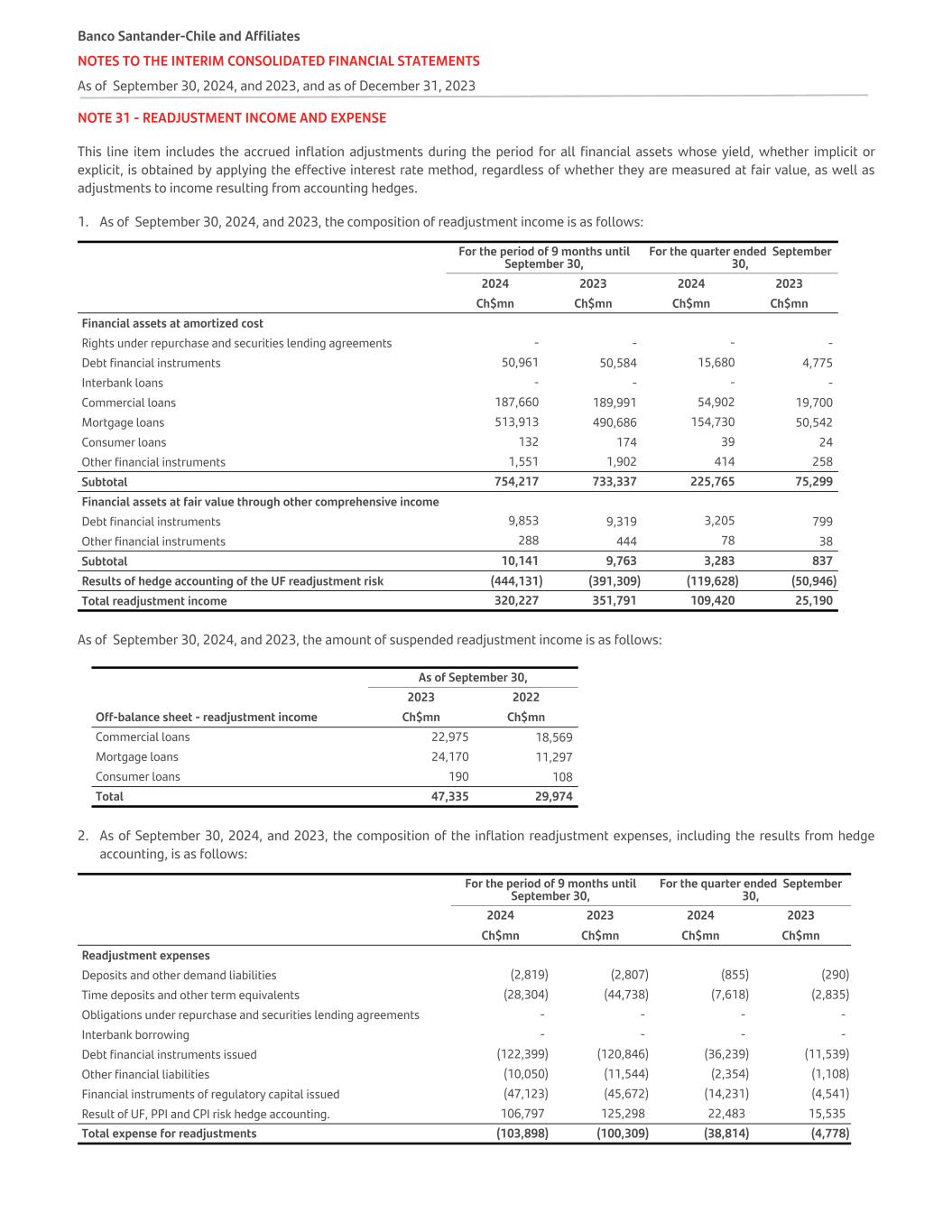 NOTE 31 - READJUSTMENT INCOME AND EXPENSE This line item includes the accrued inflation adjustments during the period for all financial assets whose yield, whether implicit or explicit, is obtained by applying the effective interest rate method, regardless of whether they are measured at fair value, as well as adjustments to income resulting from accounting hedges. 1. As of September 30, 2024, and 2023, the composition of readjustment income is as follows:   For the period of 9 months until September 30, For the quarter ended September 30, 2024 2023 2024 2023 Ch$mn Ch$mn Ch$mn Ch$mn Financial assets at amortized cost   Rights under repurchase and securities lending agreements - - - - Debt financial instruments 50,961 50,584 15,680 4,775 Interbank loans - - - - Commercial loans 187,660 189,991 54,902 19,700 Mortgage loans 513,913 490,686 154,730 50,542 Consumer loans 132 174 39 24 Other financial instruments 1,551 1,902 414 258 Subtotal 754,217 733,337 225,765 75,299 Financial assets at fair value through other comprehensive income Debt financial instruments 9,853 9,319 3,205 799 Other financial instruments 288 444 78 38 Subtotal 10,141 9,763 3,283 837 Results of hedge accounting of the UF readjustment risk (444,131) (391,309) (119,628) (50,946) Total readjustment income 320,227 351,791 109,420 25,190 As of September 30, 2024, and 2023, the amount of suspended readjustment income is as follows: As of September 30, 2023 2022 Off-balance sheet - readjustment income Ch$mn Ch$mn Commercial loans 22,975 18,569 Mortgage loans 24,170 11,297 Consumer loans 190 108 Total 47,335 29,974 2. As of September 30, 2024, and 2023, the composition of the inflation readjustment expenses, including the results from hedge accounting, is as follows: For the period of 9 months until September 30, For the quarter ended September 30, 2024 2023 2024 2023   Ch$mn Ch$mn Ch$mn Ch$mn Readjustment expenses Deposits and other demand liabilities (2,819) (2,807) (855) (290) Time deposits and other term equivalents (28,304) (44,738) (7,618) (2,835) Obligations under repurchase and securities lending agreements - - - - Interbank borrowing - - - - Debt financial instruments issued (122,399) (120,846) (36,239) (11,539) Other financial liabilities (10,050) (11,544) (2,354) (1,108) Financial instruments of regulatory capital issued (47,123) (45,672) (14,231) (4,541) Result of UF, PPI and CPI risk hedge accounting. 106,797 125,298 22,483 15,535 Total expense for readjustments (103,898) (100,309) (38,814) (4,778) Banco Santander-Chile and Affiliates NOTES TO THE INTERIM CONSOLIDATED FINANCIAL STATEMENTS As of September 30, 2024, and 2023, and as of December 31, 2023
