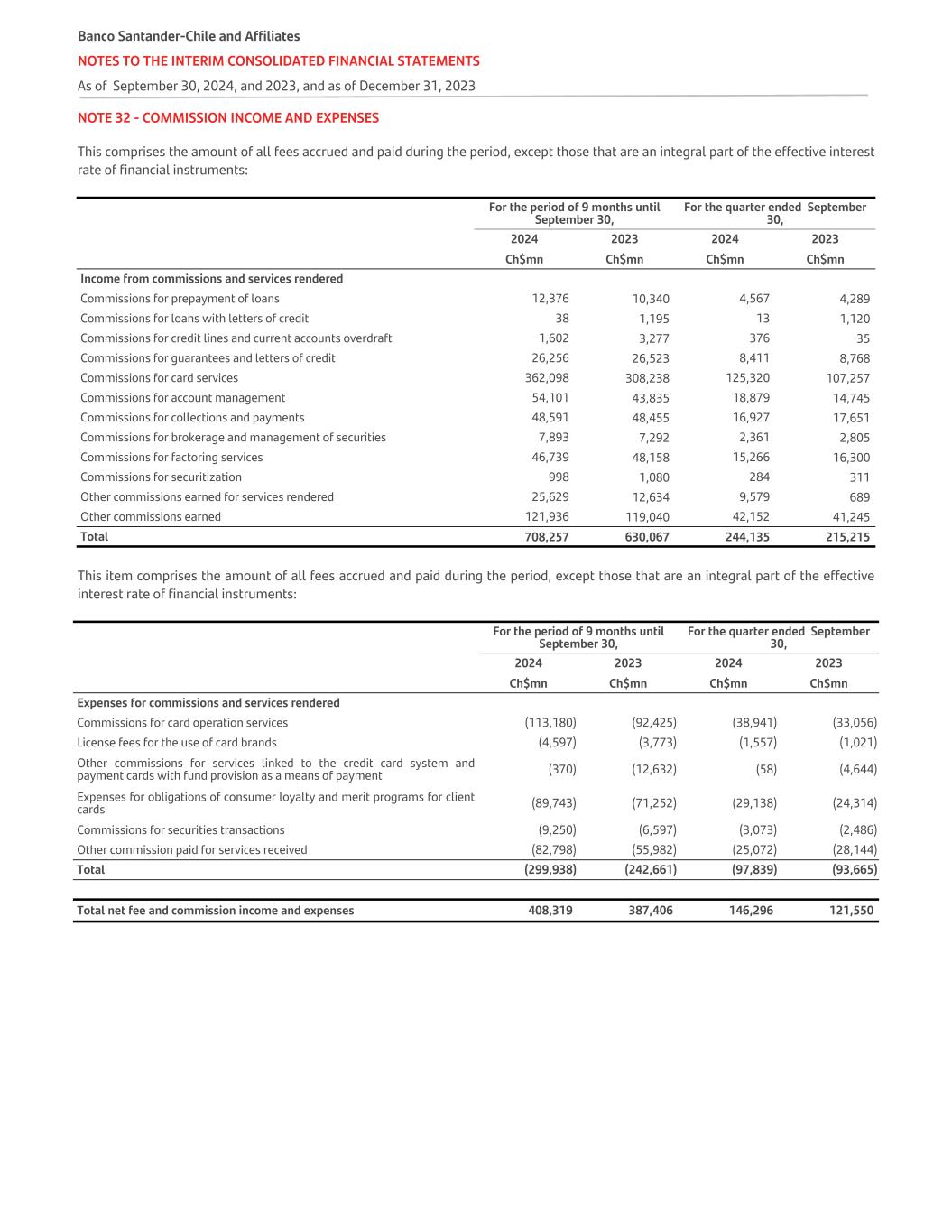 NOTE 32 - COMMISSION INCOME AND EXPENSES This comprises the amount of all fees accrued and paid during the period, except those that are an integral part of the effective interest rate of financial instruments:   For the period of 9 months until September 30, For the quarter ended September 30,   2024 2023 2024 2023   Ch$mn Ch$mn Ch$mn Ch$mn Income from commissions and services rendered Commissions for prepayment of loans 12,376 10,340 4,567 4,289 Commissions for loans with letters of credit 38 1,195 13 1,120 Commissions for credit lines and current accounts overdraft 1,602 3,277 376 35 Commissions for guarantees and letters of credit 26,256 26,523 8,411 8,768 Commissions for card services 362,098 308,238 125,320 107,257 Commissions for account management 54,101 43,835 18,879 14,745 Commissions for collections and payments 48,591 48,455 16,927 17,651 Commissions for brokerage and management of securities 7,893 7,292 2,361 2,805 Commissions for factoring services 46,739 48,158 15,266 16,300 Commissions for securitization 998 1,080 284 311 Other commissions earned for services rendered 25,629 12,634 9,579 689 Other commissions earned 121,936 119,040 42,152 41,245 Total 708,257 630,067 244,135 215,215 This item comprises the amount of all fees accrued and paid during the period, except those that are an integral part of the effective interest rate of financial instruments:   For the period of 9 months until September 30, For the quarter ended September 30,   2024 2023 2024 2023   Ch$mn Ch$mn Ch$mn Ch$mn Expenses for commissions and services rendered Commissions for card operation services (113,180) (92,425) (38,941) (33,056) License fees for the use of card brands (4,597) (3,773) (1,557) (1,021) Other commissions for services linked to the credit card system and payment cards with fund provision as a means of payment (370) (12,632) (58) (4,644) Expenses for obligations of consumer loyalty and merit programs for client cards (89,743) (71,252) (29,138) (24,314) Commissions for securities transactions (9,250) (6,597) (3,073) (2,486) Other commission paid for services received (82,798) (55,982) (25,072) (28,144) Total (299,938) (242,661) (97,839) (93,665) Total net fee and commission income and expenses 408,319 387,406 146,296 121,550 Banco Santander-Chile and Affiliates NOTES TO THE INTERIM CONSOLIDATED FINANCIAL STATEMENTS As of September 30, 2024, and 2023, and as of December 31, 2023