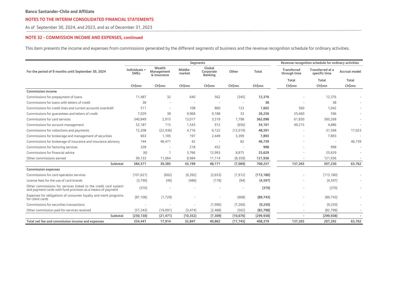 NOTE 32 - COMMISSION INCOME AND EXPENSES, continued This item presents the income and expenses from commissions generated by the different segments of business and the revenue recognition schedule for ordinary activities.   Segments Revenue recognition schedule for ordinary activities For the period of 9 months until September 30, 2024 Individuals + SMEs Wealth Management & Insurance Middle- market Global Corporate Banking Other Total Transferred through time Transferred at a specific time Accrual model Total Total Total   Ch$mn Ch$mn Ch$mn Ch$mn Ch$mn Ch$mn Ch$mn Ch$mn Ch$mn Commission income Commissions for prepayment of loans 11,487 32 640 562 (345) 12,376 - 12,376 - Commissions for loans with letters of credit 38 - - - - 38 - 38 - Commissions for credit lines and current accounts overdraft 511 - 108 860 123 1,602 560 1,042 - Commissions for guarantees and letters of credit 7,029 38 9,968 9,188 33 26,256 25,660 596 - Commissions for card services 340,849 2,915 13,017 3,519 1,798 362,098 61,830 300,268 - Commissions for account management 52,187 115 1,543 912 (656) 54,101 49,215 4,886 - Commissions for collections and payments 72,208 (22,436) 4,716 6,122 (12,019) 48,591 - 31,568 17,023 Commissions for brokerage and management of securities 663 1,185 197 2,449 3,399 7,893 - 7,893 - Commissions for brokerage of insurance and insurance advisory 144 46,471 42 - 82 46,739 - - 46,739 Commissions for factoring services 328 - 218 452 - 998 - 998 - Commissions for financial advice (6) 1 3,766 12,993 8,875 25,629 - 25,629 - Other commissions earned 99,133 11,064 8,984 11,114 (8,359) 121,936 - 121,936 - Subtotal 584,571 39,385 43,199 48,171 (7,069) 708,257 137,265 507,230 63,762 Commission expenses Commissions for card operation services (101,621) (602) (6,392) (2,653) (1,912) (113,180) - (113,180) - License fees for the use of card brands (3,790) (49) (486) (178) (94) (4,597) - (4,597) - Other commissions for services linked to the credit card system and payment cards with fund provision as a means of payment (370) - - - - (370) - (370) - Expenses for obligations of consumer loyalty and merit programs for client cards (87,106) (1,729) - - (908) (89,743) - (89,743) - Commissions for securities transactions - - - (1,990) (7,260) (9,250) - (9,250) - Other commission paid for services received (57,243) (19,091) (3,474) (2,488) (502) (82,798) - (82,798) - Subtotal (250,130) (21,471) (10,352) (7,309) (10,676) (299,938) - (299,938) - Total net fee and commission income and expenses 334,441 17,914 32,847 40,862 (17,745) 408,319 137,265 207,292 63,762 Banco Santander-Chile and Affiliate NOTES TO THE INTERIM CONSOLIDATED FINANCIAL STATEMENTS As of September 30, 2024, and 2023, and as of December 31, 2023