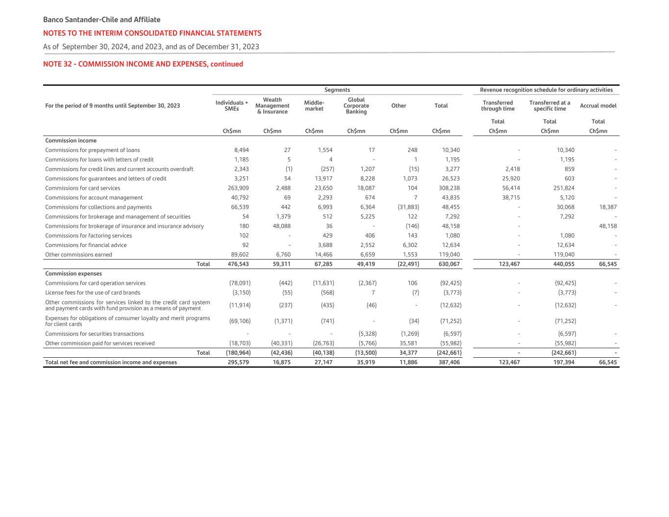NOTE 32 - COMMISSION INCOME AND EXPENSES, continued Segments Revenue recognition schedule for ordinary activities For the period of 9 months until September 30, 2023 Individuals + SMEs Wealth Management & Insurance Middle- market Global Corporate Banking Other Total Transferred through time Transferred at a specific time Accrual model Total Total Total Ch$mn Ch$mn Ch$mn Ch$mn Ch$mn Ch$mn Ch$mn Ch$mn Ch$mn Commission income Commissions for prepayment of loans 8,494 27 1,554 17 248 10,340 - 10,340 - Commissions for loans with letters of credit 1,185 5 4 - 1 1,195 - 1,195 - Commissions for credit lines and current accounts overdraft 2,343 (1) (257) 1,207 (15) 3,277 2,418 859 - Commissions for guarantees and letters of credit 3,251 54 13,917 8,228 1,073 26,523 25,920 603 - Commissions for card services 263,909 2,488 23,650 18,087 104 308,238 56,414 251,824 - Commissions for account management 40,792 69 2,293 674 7 43,835 38,715 5,120 - Commissions for collections and payments 66,539 442 6,993 6,364 (31,883) 48,455 - 30,068 18,387 Commissions for brokerage and management of securities 54 1,379 512 5,225 122 7,292 - 7,292 - Commissions for brokerage of insurance and insurance advisory 180 48,088 36 - (146) 48,158 - 48,158 Commissions for factoring services 102 - 429 406 143 1,080 - 1,080 - Commissions for financial advice 92 - 3,688 2,552 6,302 12,634 - 12,634 - Other commissions earned 89,602 6,760 14,466 6,659 1,553 119,040 - 119,040 - Total 476,543 59,311 67,285 49,419 (22,491) 630,067 123,467 440,055 66,545 Commission expenses Commissions for card operation services (78,091) (442) (11,631) (2,367) 106 (92,425) - (92,425) - License fees for the use of card brands (3,150) (55) (568) 7 (7) (3,773) - (3,773) - Other commissions for services linked to the credit card system and payment cards with fund provision as a means of payment (11,914) (237) (435) (46) - (12,632) - (12,632) - Expenses for obligations of consumer loyalty and merit programs for client cards (69,106) (1,371) (741) - (34) (71,252) - (71,252) Commissions for securities transactions - - - (5,328) (1,269) (6,597) - (6,597) - Other commission paid for services received (18,703) (40,331) (26,763) (5,766) 35,581 (55,982) - (55,982) - Total (180,964) (42,436) (40,138) (13,500) 34,377 (242,661) - (242,661) - Total net fee and commission income and expenses 295,579 16,875 27,147 35,919 11,886 387,406 123,467 197,394 66,545 Banco Santander-Chile and Affiliate NOTES TO THE INTERIM CONSOLIDATED FINANCIAL STATEMENTS As of September 30, 2024, and 2023, and as of December 31, 2023