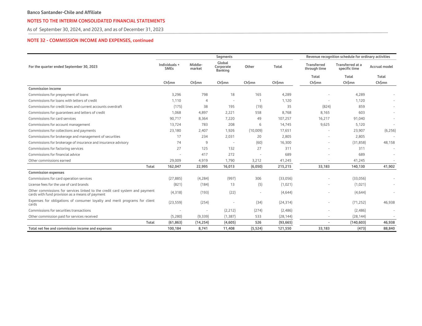 NOTE 32 - COMMISSION INCOME AND EXPENSES, continued   Segments Revenue recognition schedule for ordinary activities For the quarter ended September 30, 2024 Individuals + SMEs Middle- market Global Corporate Banking Other Total Transferred through time Transferred at a specific time Accrual model Total Total Total   Ch$mn Ch$mn Ch$mn Ch$mn Ch$mn Ch$mn Ch$mn Ch$mn Commission income Commissions for prepayment of loans 4,320 159 280 (199) 4,567 - 4,567 - Commissions for loans with letters of credit 13 - - - 13 - 13 - Commissions for credit lines and current accounts overdraft 172 10 195 (1) 376 (666) 1,042 - Commissions for guarantees and letters of credit 2,227 3,579 2,897 (302) 8,411 7,815 596 - Commissions for card services 117,081 4,701 1,337 1,221 125,320 35,784 89,536 - Commissions for account management 18,404 499 297 (358) 18,879 13,993 4,886 - Commissions for collections and payments 26,487 1,629 2,511 (13,893) 16,927 - 28,084 (11,157) Commissions for brokerage and management of securities 177 93 1,047 463 2,361 - 2,361 - Commissions for brokerage of insurance and insurance advisory 46 18 - 82 15,266 - - 15,266 Commissions for factoring services 100 69 115 - 284 - 284 - Commissions for financial advice - - - 9,579 9,579 - 9,579 - Other commissions earned 33,937 4,641 8,556 (9,197) 42,152 - 42,152 - Total 202,964 15,398 17,235 (12,605) 244,135 56,926 183,100 4,109 Commission expenses Commissions for card operation services (34,229) (2,354) (996) (1,197) (38,941) - (38,941) - License fees for the use of card brands (1,223) (184) (81) (56) (1,557) - (1,557) - Other commissions for services linked to the credit card system and payment cards with fund provision as a means of payment (58) - - - (58) - (58) - Expenses for obligations of consumer loyalty and merit programs for client cards (28,232) - - (338) (29,138) - (29,138) - Commissions for securities transactions - - (464) (2,609) (3,073) - (3,073) - Other commission paid for services received (15,557) (1,057) (911) 7,356 (25,072) - (25,072) - Total (79,299) (3,595) (2,452) 3,156 (97,839) - (97,839) - Total net fee and commission income and expenses 123,665 11,803 14,783 (9,449) 146,296 56,926 85,261 4,109 Banco Santander-Chile and Affiliate NOTES TO THE INTERIM CONSOLIDATED FINANCIAL STATEMENTS As of September 30, 2024, and 2023, and as of December 31, 2023