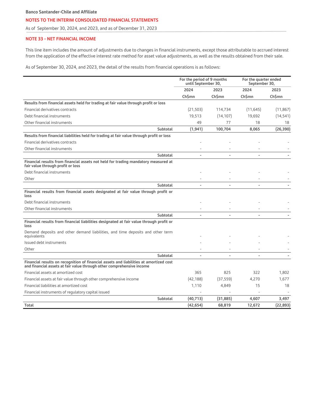 NOTE 33 - NET FINANCIAL INCOME This line item includes the amount of adjustments due to changes in financial instruments, except those attributable to accrued interest from the application of the effective interest rate method for asset value adjustments, as well as the results obtained from their sale. As of September 30, 2024, and 2023, the detail of the results from financial operations is as follows: For the period of 9 months until September 30, For the quarter ended September 30, 2024 2023 2024 2023 Ch$mn Ch$mn Ch$mn Ch$mn Results from financial assets held for trading at fair value through profit or loss Financial derivatives contracts (21,503) 114,734 (11,645) (11,867) Debt financial instruments 19,513 (14,107) 19,692 (14,541) Other financial instruments 49 77 18 18 Subtotal (1,941) 100,704 8,065 (26,390) Results from financial liabilities held for trading at fair value through profit or loss   Financial derivatives contracts - - - - Other financial instruments - - - - Subtotal - - - - Financial results from financial assets not held for trading mandatory measured at fair value through profit or loss   Debt financial instruments - - - - Other - - - - Subtotal - - - - Financial results from financial assets designated at fair value through profit or loss Debt financial instruments - - - - Other financial instruments - - - - Subtotal - - - - Financial results from financial liabilities designated at fair value through profit or loss Demand deposits and other demand liabilities, and time deposits and other term equivalents - - - - Issued debt instruments - - - - Other - - - - Subtotal - - - - Financial results on recognition of financial assets and liabilities at amortized cost and financial assets at fair value through other comprehensive income Financial assets at amortized cost 365 825 322 1,802 Financial assets at fair value through other comprehensive income (42,188) (37,559) 4,270 1,677 Financial liabilities at amortized cost 1,110 4,849 15 18 Financial instruments of regulatory capital issued - - - - Subtotal (40,713) (31,885) 4,607 3,497 Total (42,654) 68,819 12,672 (22,893) Banco Santander-Chile and Affiliate NOTES TO THE INTERIM CONSOLIDATED FINANCIAL STATEMENTS As of September 30, 2024, and 2023, and as of December 31, 2023