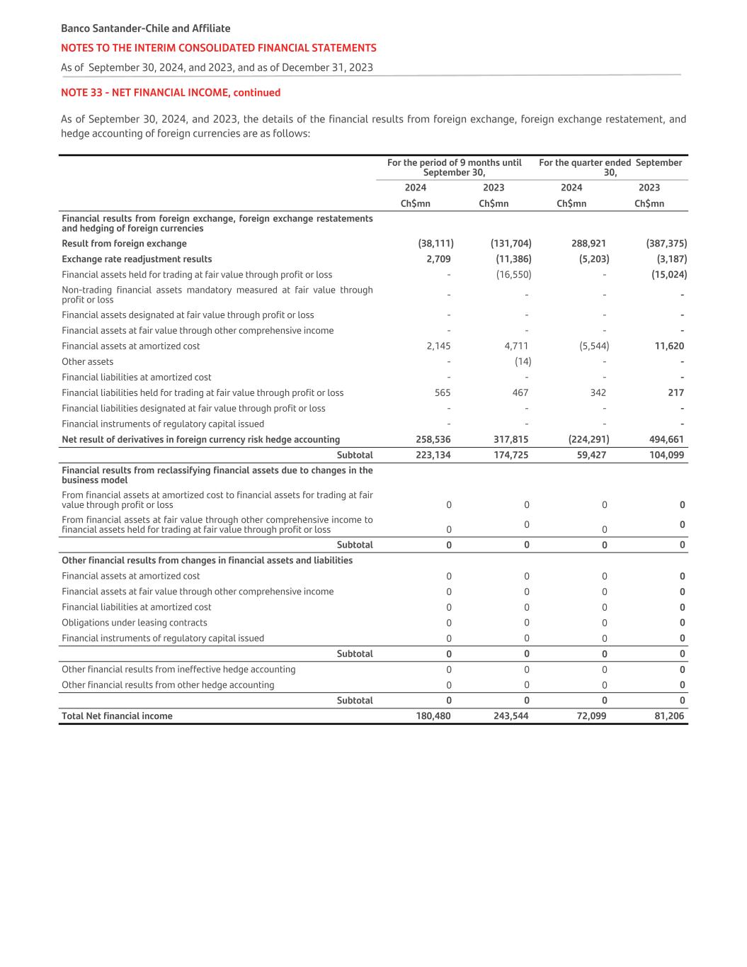 NOTE 33 - NET FINANCIAL INCOME, continued As of September 30, 2024, and 2023, the details of the financial results from foreign exchange, foreign exchange restatement, and hedge accounting of foreign currencies are as follows: For the period of 9 months until September 30, For the quarter ended September 30, 2024 2023 2024 2023 Ch$mn Ch$mn Ch$mn Ch$mn Financial results from foreign exchange, foreign exchange restatements and hedging of foreign currencies   Result from foreign exchange (38,111) (131,704) 288,921 (387,375) Exchange rate readjustment results 2,709 (11,386) (5,203) (3,187) Financial assets held for trading at fair value through profit or loss - (16,550) - (15,024) Non-trading financial assets mandatory measured at fair value through profit or loss - - - - Financial assets designated at fair value through profit or loss - - - - Financial assets at fair value through other comprehensive income - - - - Financial assets at amortized cost 2,145 4,711 (5,544) 11,620 Other assets - (14) - - Financial liabilities at amortized cost - - - - Financial liabilities held for trading at fair value through profit or loss 565 467 342 217 Financial liabilities designated at fair value through profit or loss - - - - Financial instruments of regulatory capital issued - - - - Net result of derivatives in foreign currency risk hedge accounting 258,536 317,815 (224,291) 494,661 Subtotal 223,134 174,725 59,427 104,099 Financial results from reclassifying financial assets due to changes in the business model From financial assets at amortized cost to financial assets for trading at fair value through profit or loss 0 0 0 0 From financial assets at fair value through other comprehensive income to financial assets held for trading at fair value through profit or loss 0 0 0 0 Subtotal 0 0 0 0 Other financial results from changes in financial assets and liabilities Financial assets at amortized cost 0 0 0 0 Financial assets at fair value through other comprehensive income 0 0 0 0 Financial liabilities at amortized cost 0 0 0 0 Obligations under leasing contracts 0 0 0 0 Financial instruments of regulatory capital issued 0 0 0 0 Subtotal 0 0 0 0 Other financial results from ineffective hedge accounting 0 0 0 0 Other financial results from other hedge accounting 0 0 0 0 Subtotal 0 0 0 0 Total Net financial income 180,480 243,544 72,099 81,206 Banco Santander-Chile and Affiliate NOTES TO THE INTERIM CONSOLIDATED FINANCIAL STATEMENTS As of September 30, 2024, and 2023, and as of December 31, 2023