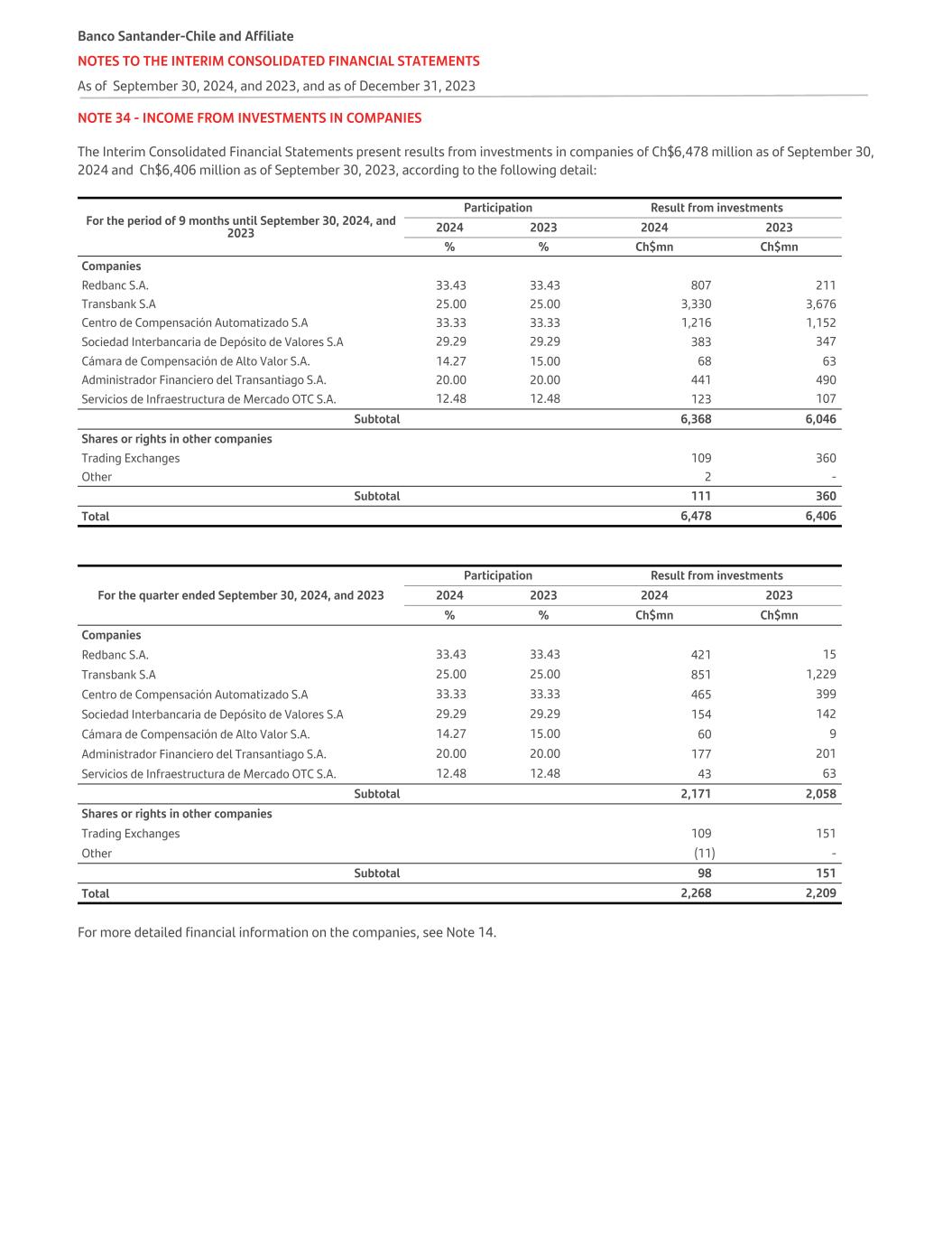NOTE 34 - INCOME FROM INVESTMENTS IN COMPANIES The Interim Consolidated Financial Statements present results from investments in companies of Ch$6,478 million as of September 30, 2024 and Ch$6,406 million as of September 30, 2023, according to the following detail: For the period of 9 months until September 30, 2024, and 2023 Participation Result from investments 2024 2023 2024 2023 % % Ch$mn Ch$mn Companies Redbanc S.A. 33.43 33.43 807 211 Transbank S.A 25.00 25.00 3,330 3,676 Centro de Compensación Automatizado S.A 33.33 33.33 1,216 1,152 Sociedad Interbancaria de Depósito de Valores S.A 29.29 29.29 383 347 Cámara de Compensación de Alto Valor S.A. 14.27 15.00 68 63 Administrador Financiero del Transantiago S.A. 20.00 20.00 441 490 Servicios de Infraestructura de Mercado OTC S.A. 12.48 12.48 123 107 Subtotal 6,368 6,046 Shares or rights in other companies Trading Exchanges 109 360 Other 2 - Subtotal 111 360 Total 6,478 6,406 For the quarter ended September 30, 2024, and 2023 Participation Result from investments 2024 2023 2024 2023 % % Ch$mn Ch$mn Companies Redbanc S.A. 33.43 33.43 421 15 Transbank S.A 25.00 25.00 851 1,229 Centro de Compensación Automatizado S.A 33.33 33.33 465 399 Sociedad Interbancaria de Depósito de Valores S.A 29.29 29.29 154 142 Cámara de Compensación de Alto Valor S.A. 14.27 15.00 60 9 Administrador Financiero del Transantiago S.A. 20.00 20.00 177 201 Servicios de Infraestructura de Mercado OTC S.A. 12.48 12.48 43 63 Subtotal 2,171 2,058 Shares or rights in other companies Trading Exchanges 109 151 Other (11) - Subtotal 98 151 Total 2,268 2,209 For more detailed financial information on the companies, see Note 14. Banco Santander-Chile and Affiliate NOTES TO THE INTERIM CONSOLIDATED FINANCIAL STATEMENTS As of September 30, 2024, and 2023, and as of December 31, 2023