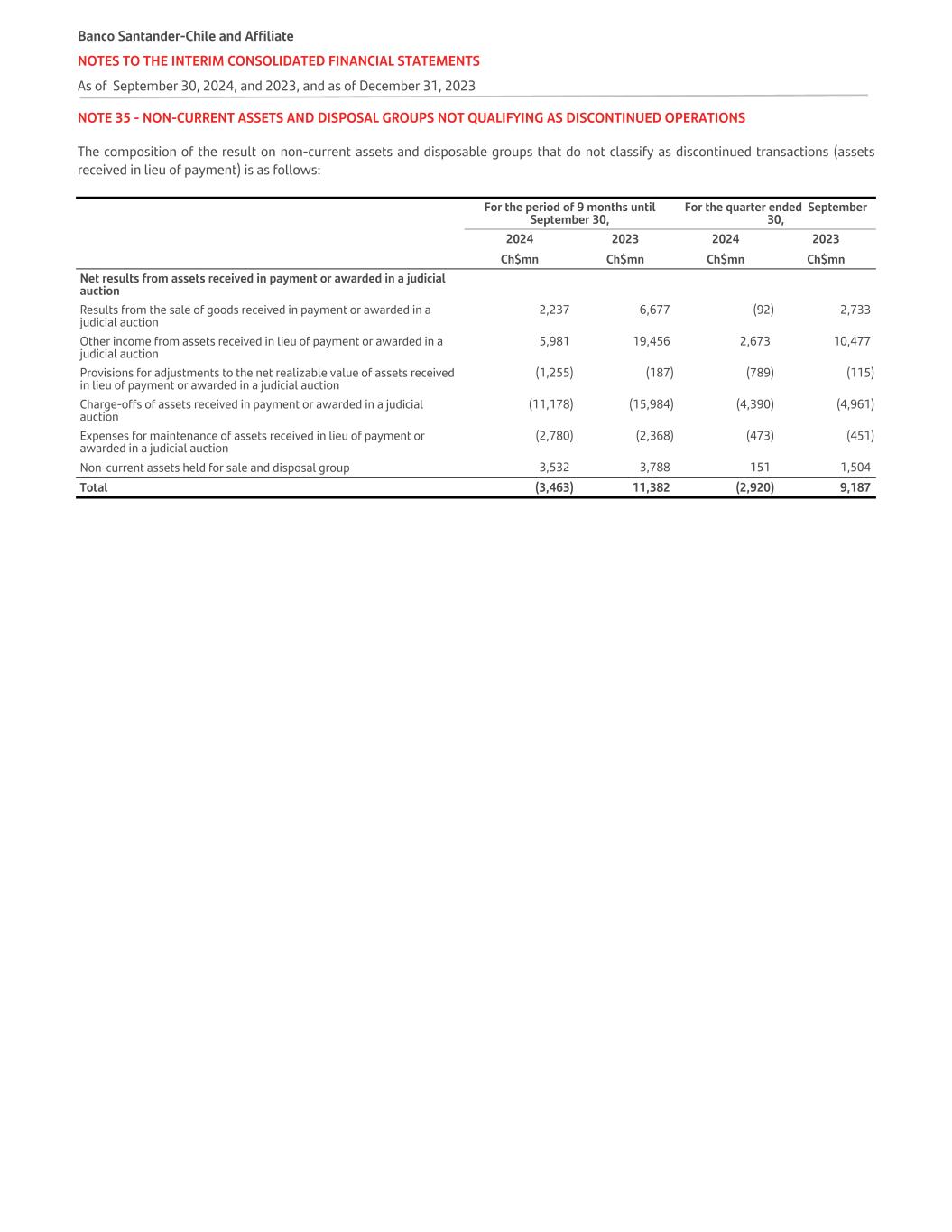 NOTE 35 - NON-CURRENT ASSETS AND DISPOSAL GROUPS NOT QUALIFYING AS DISCONTINUED OPERATIONS The composition of the result on non-current assets and disposable groups that do not classify as discontinued transactions (assets received in lieu of payment) is as follows:   For the period of 9 months until September 30, For the quarter ended September 30,   2024 2023 2024 2023   Ch$mn Ch$mn Ch$mn Ch$mn Net results from assets received in payment or awarded in a judicial auction Results from the sale of goods received in payment or awarded in a judicial auction 2,237 6,677 (92) 2,733 Other income from assets received in lieu of payment or awarded in a judicial auction 5,981 19,456 2,673 10,477 Provisions for adjustments to the net realizable value of assets received in lieu of payment or awarded in a judicial auction (1,255) (187) (789) (115) Charge-offs of assets received in payment or awarded in a judicial auction (11,178) (15,984) (4,390) (4,961) Expenses for maintenance of assets received in lieu of payment or awarded in a judicial auction (2,780) (2,368) (473) (451) Non-current assets held for sale and disposal group 3,532 3,788 151 1,504 Total (3,463) 11,382 (2,920) 9,187 Banco Santander-Chile and Affiliate NOTES TO THE INTERIM CONSOLIDATED FINANCIAL STATEMENTS As of September 30, 2024, and 2023, and as of December 31, 2023
