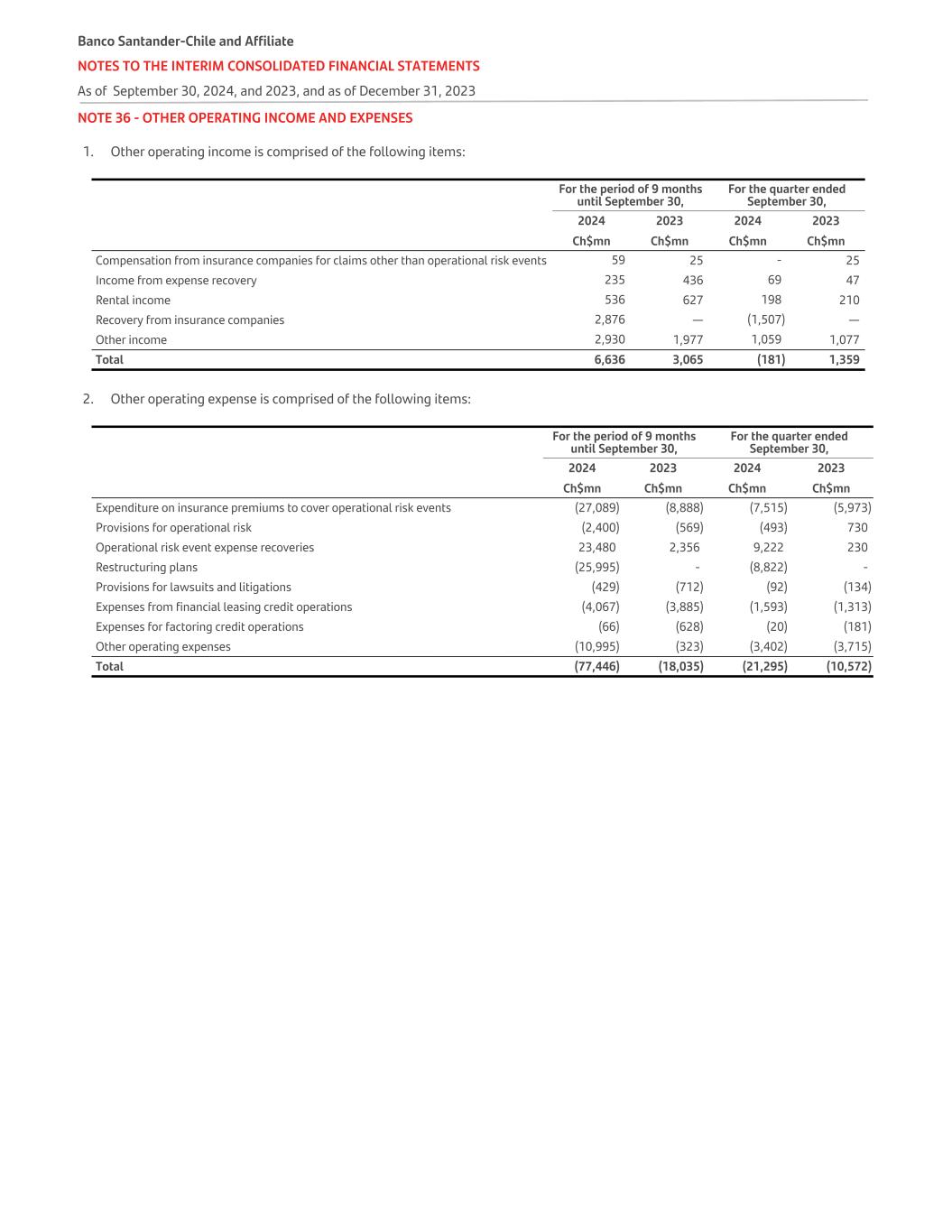 NOTE 36 - OTHER OPERATING INCOME AND EXPENSES 1. Other operating income is comprised of the following items:   For the period of 9 months until September 30, For the quarter ended September 30,   2024 2023 2024 2023   Ch$mn Ch$mn Ch$mn Ch$mn Compensation from insurance companies for claims other than operational risk events 59 25 - 25 Income from expense recovery 235 436 69 47 Rental income 536 627 198 210 Recovery from insurance companies 2,876 — (1,507) — Other income 2,930 1,977 1,059 1,077 Total 6,636 3,065 (181) 1,359 2. Other operating expense is comprised of the following items: For the period of 9 months until September 30, For the quarter ended September 30,   2024 2023 2024 2023   Ch$mn Ch$mn Ch$mn Ch$mn Expenditure on insurance premiums to cover operational risk events (27,089) (8,888) (7,515) (5,973) Provisions for operational risk (2,400) (569) (493) 730 Operational risk event expense recoveries 23,480 2,356 9,222 230 Restructuring plans (25,995) - (8,822) - Provisions for lawsuits and litigations (429) (712) (92) (134) Expenses from financial leasing credit operations (4,067) (3,885) (1,593) (1,313) Expenses for factoring credit operations (66) (628) (20) (181) Other operating expenses (10,995) (323) (3,402) (3,715) Total (77,446) (18,035) (21,295) (10,572) Banco Santander-Chile and Affiliate NOTES TO THE INTERIM CONSOLIDATED FINANCIAL STATEMENTS As of September 30, 2024, and 2023, and as of December 31, 2023