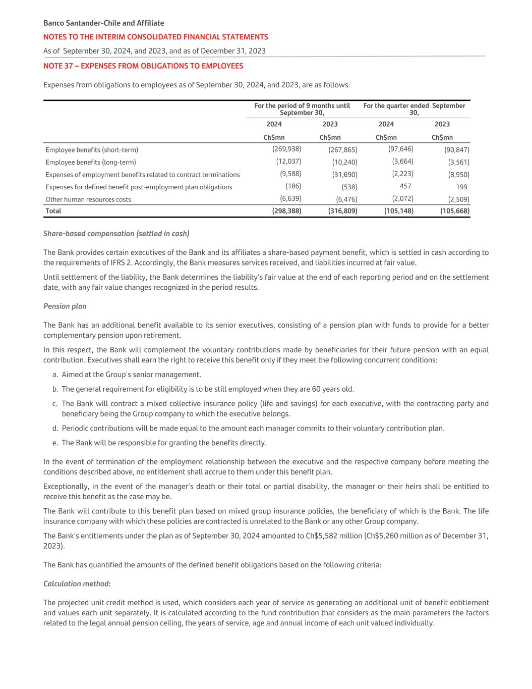 NOTE 37 – EXPENSES FROM OBLIGATIONS TO EMPLOYEES Expenses from obligations to employees as of September 30, 2024, and 2023, are as follows:   For the period of 9 months until September 30, For the quarter ended September 30,   2024 2023 2024 2023   Ch$mn Ch$mn Ch$mn Ch$mn Employee benefits (short-term) (269,938) (267,865) (97,646) (90,847) Employee benefits (long-term) (12,037) (10,240) (3,664) (3,561) Expenses of employment benefits related to contract terminations (9,588) (31,690) (2,223) (8,950) Expenses for defined benefit post-employment plan obligations (186) (538) 457 199 Other human resources costs (6,639) (6,476) (2,072) (2,509) Total (298,388) (316,809) (105,148) (105,668) Share-based compensation (settled in cash) The Bank provides certain executives of the Bank and its affiliates a share-based payment benefit, which is settled in cash according to the requirements of IFRS 2. Accordingly, the Bank measures services received, and liabilities incurred at fair value. Until settlement of the liability, the Bank determines the liability's fair value at the end of each reporting period and on the settlement date, with any fair value changes recognized in the period results. Pension plan The Bank has an additional benefit available to its senior executives, consisting of a pension plan with funds to provide for a better complementary pension upon retirement. In this respect, the Bank will complement the voluntary contributions made by beneficiaries for their future pension with an equal contribution. Executives shall earn the right to receive this benefit only if they meet the following concurrent conditions: a. Aimed at the Group's senior management. b. The general requirement for eligibility is to be still employed when they are 60 years old. c. The Bank will contract a mixed collective insurance policy (life and savings) for each executive, with the contracting party and beneficiary being the Group company to which the executive belongs. d. Periodic contributions will be made equal to the amount each manager commits to their voluntary contribution plan. e. The Bank will be responsible for granting the benefits directly. In the event of termination of the employment relationship between the executive and the respective company before meeting the conditions described above, no entitlement shall accrue to them under this benefit plan. Exceptionally, in the event of the manager's death or their total or partial disability, the manager or their heirs shall be entitled to receive this benefit as the case may be. The Bank will contribute to this benefit plan based on mixed group insurance policies, the beneficiary of which is the Bank. The life insurance company with which these policies are contracted is unrelated to the Bank or any other Group company. The Bank's entitlements under the plan as of September 30, 2024 amounted to Ch$5,582 million (Ch$5,260 million as of December 31, 2023). The Bank has quantified the amounts of the defined benefit obligations based on the following criteria: Calculation method: The projected unit credit method is used, which considers each year of service as generating an additional unit of benefit entitlement and values each unit separately. It is calculated according to the fund contribution that considers as the main parameters the factors related to the legal annual pension ceiling, the years of service, age and annual income of each unit valued individually. Banco Santander-Chile and Affiliate NOTES TO THE INTERIM CONSOLIDATED FINANCIAL STATEMENTS As of September 30, 2024, and 2023, and as of December 31, 2023