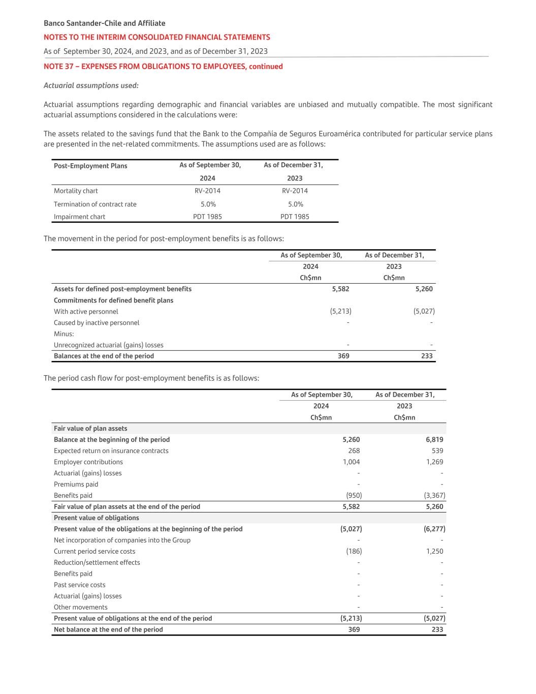 NOTE 37 – EXPENSES FROM OBLIGATIONS TO EMPLOYEES, continued Actuarial assumptions used: Actuarial assumptions regarding demographic and financial variables are unbiased and mutually compatible. The most significant actuarial assumptions considered in the calculations were: The assets related to the savings fund that the Bank to the Compañía de Seguros Euroamérica contributed for particular service plans are presented in the net-related commitments. The assumptions used are as follows: Post-Employment Plans As of September 30, As of December 31, 2024 2023 Mortality chart RV-2014 RV-2014 Termination of contract rate 5.0% 5.0% Impairment chart PDT 1985 PDT 1985 The movement in the period for post-employment benefits is as follows:   As of September 30, As of December 31, 2024 2023 Ch$mn Ch$mn Assets for defined post-employment benefits 5,582 5,260 Commitments for defined benefit plans With active personnel (5,213) (5,027) Caused by inactive personnel - - Minus: Unrecognized actuarial (gains) losses - - Balances at the end of the period 369 233 The period cash flow for post-employment benefits is as follows:   As of September 30, As of December 31, 2024 2023 Ch$mn Ch$mn Fair value of plan assets Balance at the beginning of the period 5,260 6,819 Expected return on insurance contracts 268 539 Employer contributions 1,004 1,269 Actuarial (gains) losses - - Premiums paid - - Benefits paid (950) (3,367) Fair value of plan assets at the end of the period 5,582 5,260 Present value of obligations Present value of the obligations at the beginning of the period (5,027) (6,277) Net incorporation of companies into the Group - - Current period service costs (186) 1,250 Reduction/settlement effects - - Benefits paid - - Past service costs - - Actuarial (gains) losses - - Other movements - - Present value of obligations at the end of the period (5,213) (5,027) Net balance at the end of the period 369 233 Banco Santander-Chile and Affiliate NOTES TO THE INTERIM CONSOLIDATED FINANCIAL STATEMENTS As of September 30, 2024, and 2023, and as of December 31, 2023