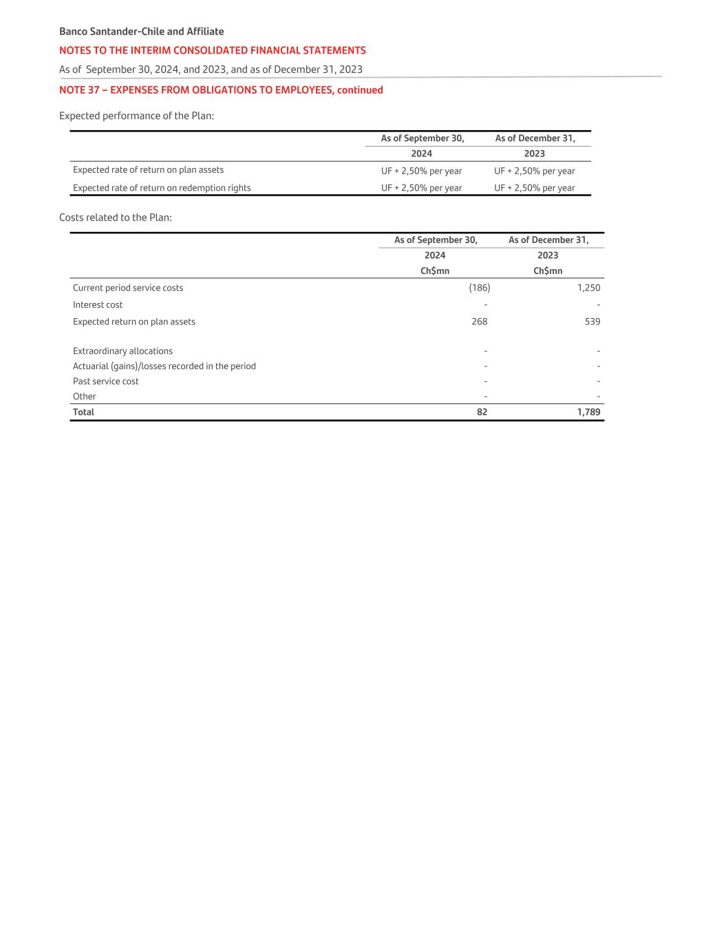 NOTE 37 – EXPENSES FROM OBLIGATIONS TO EMPLOYEES, continued Expected performance of the Plan:   As of September 30, As of December 31, 2024 2023 Expected rate of return on plan assets UF + 2,50% per year UF + 2,50% per year Expected rate of return on redemption rights UF + 2,50% per year UF + 2,50% per year Costs related to the Plan:   As of September 30, As of December 31, 2024 2023 Ch$mn Ch$mn Current period service costs (186) 1,250 Interest cost - - Expected return on plan assets 268 539 Extraordinary allocations - - Actuarial (gains)/losses recorded in the period - - Past service cost - - Other - - Total 82 1,789 Banco Santander-Chile and Affiliate NOTES TO THE INTERIM CONSOLIDATED FINANCIAL STATEMENTS As of September 30, 2024, and 2023, and as of December 31, 2023
