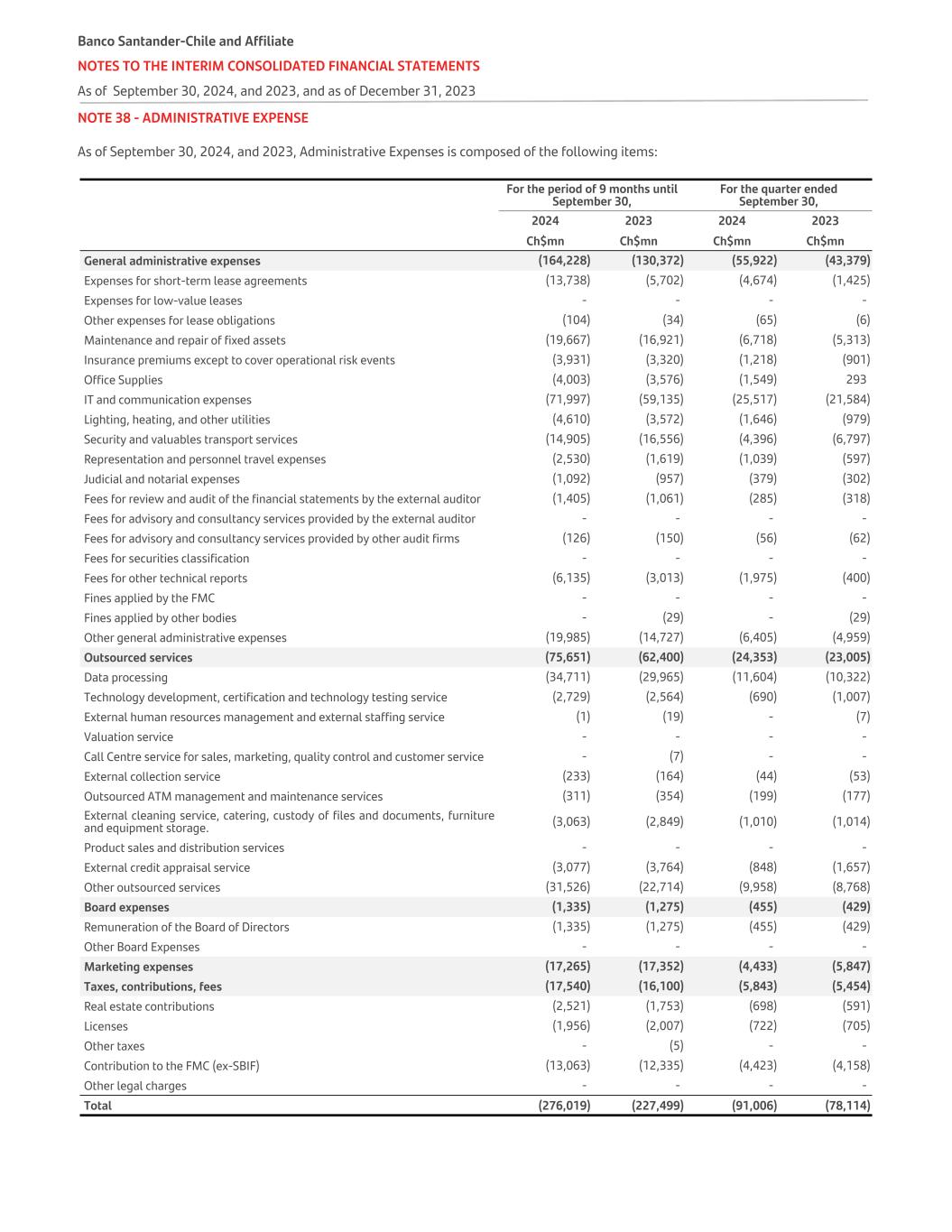 NOTE 38 - ADMINISTRATIVE EXPENSE As of September 30, 2024, and 2023, Administrative Expenses is composed of the following items:   For the period of 9 months until September 30, For the quarter ended September 30,   2024 2023 2024 2023   Ch$mn Ch$mn Ch$mn Ch$mn General administrative expenses (164,228) (130,372) (55,922) (43,379) Expenses for short-term lease agreements (13,738) (5,702) (4,674) (1,425) Expenses for low-value leases - - - - Other expenses for lease obligations (104) (34) (65) (6) Maintenance and repair of fixed assets (19,667) (16,921) (6,718) (5,313) Insurance premiums except to cover operational risk events (3,931) (3,320) (1,218) (901) Office Supplies (4,003) (3,576) (1,549) 293 IT and communication expenses (71,997) (59,135) (25,517) (21,584) Lighting, heating, and other utilities (4,610) (3,572) (1,646) (979) Security and valuables transport services (14,905) (16,556) (4,396) (6,797) Representation and personnel travel expenses (2,530) (1,619) (1,039) (597) Judicial and notarial expenses (1,092) (957) (379) (302) Fees for review and audit of the financial statements by the external auditor (1,405) (1,061) (285) (318) Fees for advisory and consultancy services provided by the external auditor - - - - Fees for advisory and consultancy services provided by other audit firms (126) (150) (56) (62) Fees for securities classification - - - - Fees for other technical reports (6,135) (3,013) (1,975) (400) Fines applied by the FMC - - - - Fines applied by other bodies - (29) - (29) Other general administrative expenses (19,985) (14,727) (6,405) (4,959) Outsourced services (75,651) (62,400) (24,353) (23,005) Data processing (34,711) (29,965) (11,604) (10,322) Technology development, certification and technology testing service (2,729) (2,564) (690) (1,007) External human resources management and external staffing service (1) (19) - (7) Valuation service - - - - Call Centre service for sales, marketing, quality control and customer service - (7) - - External collection service (233) (164) (44) (53) Outsourced ATM management and maintenance services (311) (354) (199) (177) External cleaning service, catering, custody of files and documents, furniture and equipment storage. (3,063) (2,849) (1,010) (1,014) Product sales and distribution services - - - - External credit appraisal service (3,077) (3,764) (848) (1,657) Other outsourced services (31,526) (22,714) (9,958) (8,768) Board expenses (1,335) (1,275) (455) (429) Remuneration of the Board of Directors (1,335) (1,275) (455) (429) Other Board Expenses - - - - Marketing expenses (17,265) (17,352) (4,433) (5,847) Taxes, contributions, fees (17,540) (16,100) (5,843) (5,454) Real estate contributions (2,521) (1,753) (698) (591) Licenses (1,956) (2,007) (722) (705) Other taxes - (5) - - Contribution to the FMC (ex-SBIF) (13,063) (12,335) (4,423) (4,158) Other legal charges - - - - Total (276,019) (227,499) (91,006) (78,114) Banco Santander-Chile and Affiliate NOTES TO THE INTERIM CONSOLIDATED FINANCIAL STATEMENTS As of September 30, 2024, and 2023, and as of December 31, 2023