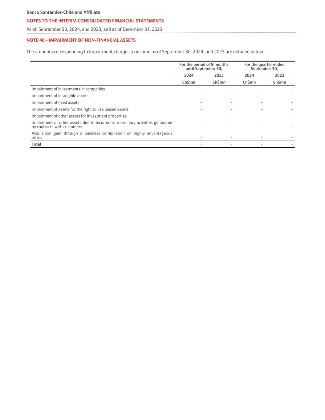 NOTE 40 - IMPAIRMENT OF NON-FINANCIAL ASSETS The amounts corresponding to impairment charges to income as of September 30, 2024, and 2023 are detailed below: For the period of 9 months until September 30, For the quarter ended September 30,   2024 2023 2024 2023   Ch$mn Ch$mn Ch$mn Ch$mn Impairment of investments in companies - - - - Impairment of intangible assets - - - - Impairment of fixed assets - - - - Impairment of assets for the right to use leased assets - - - - Impairment of other assets for investment properties - - - - Impairment of other assets due to income from ordinary activities generated by contracts with customers - - - - Acquisition gain through a business combination on highly advantageous terms - - - - Total - - - - Banco Santander-Chile and Affiliate NOTES TO THE INTERIM CONSOLIDATED FINANCIAL STATEMENTS As of September 30, 2024, and 2023, and as of December 31, 2023