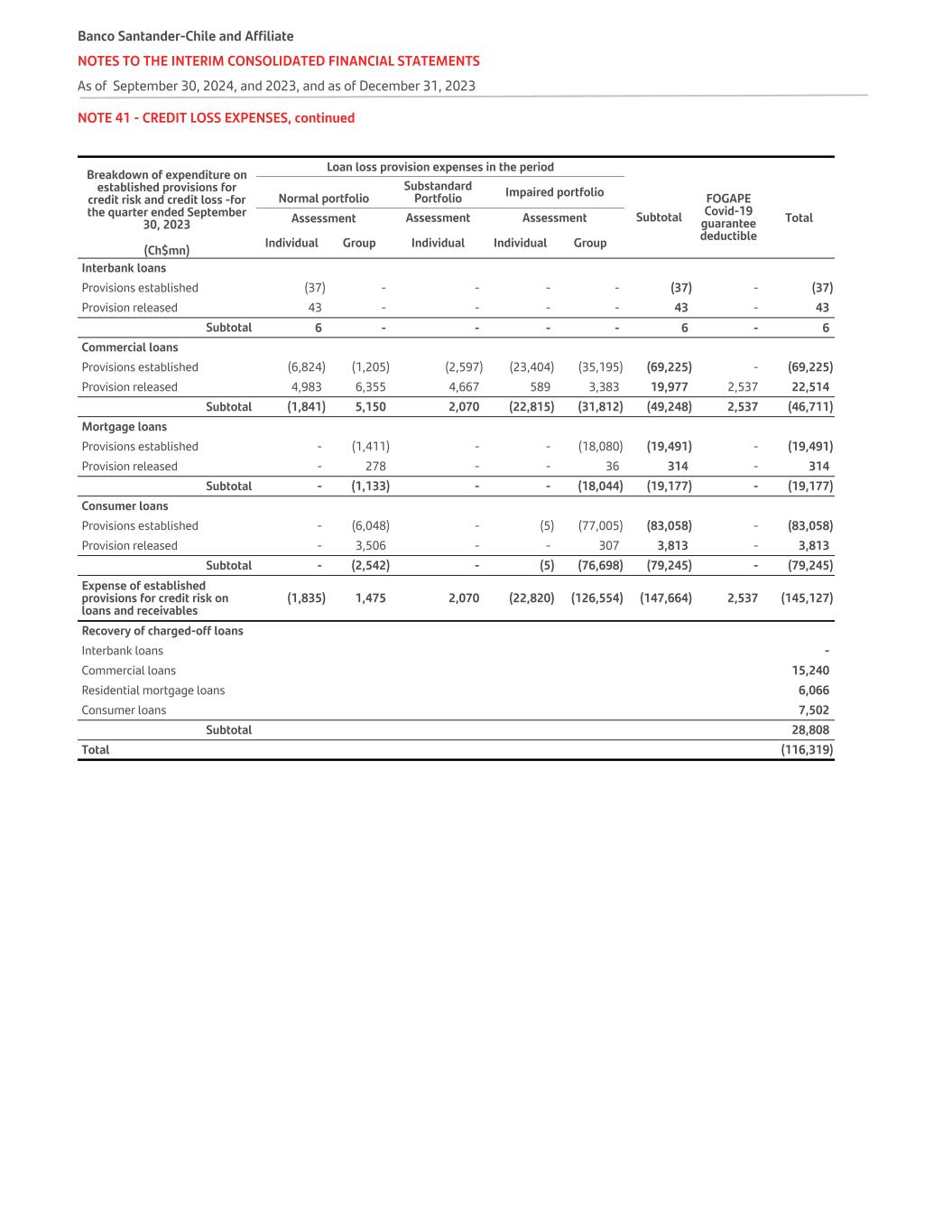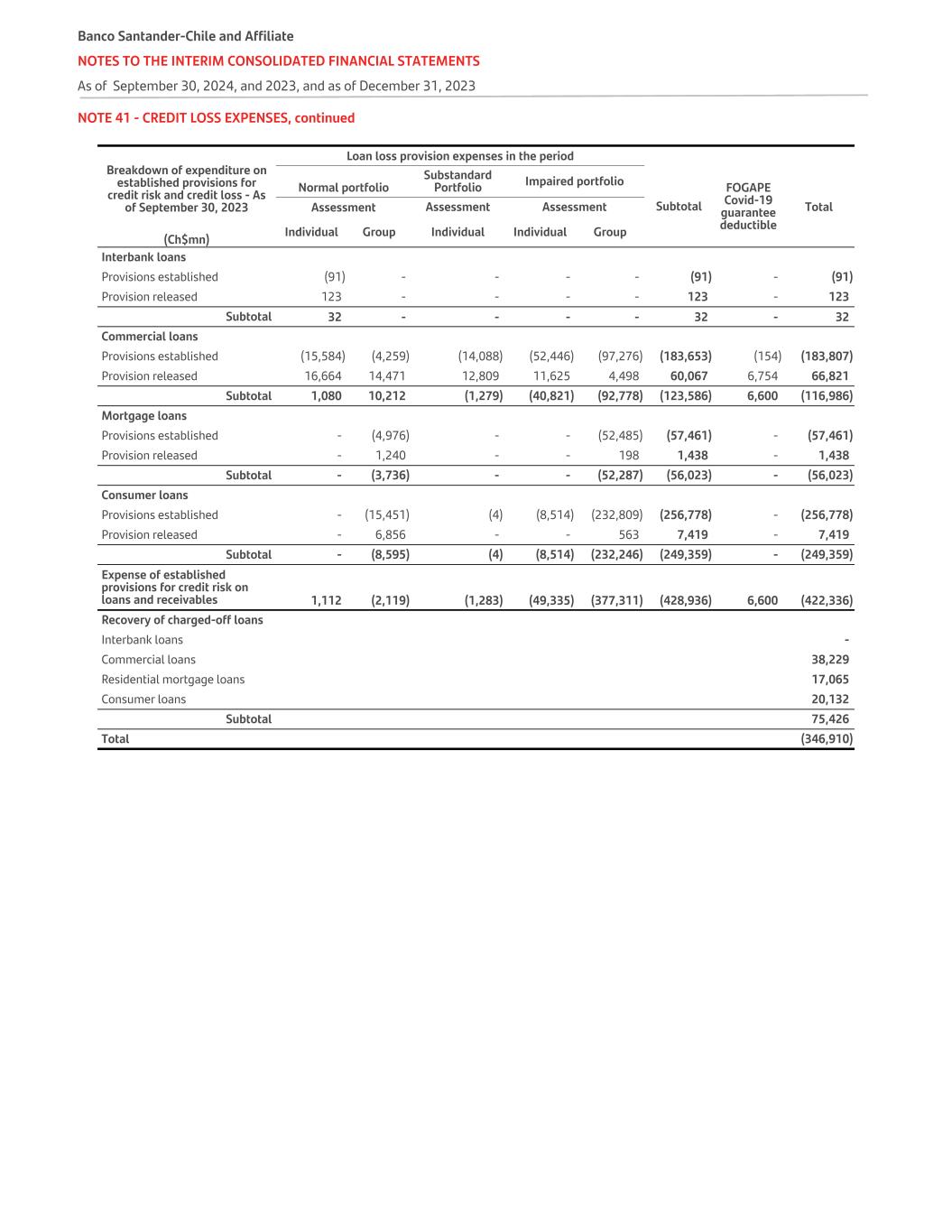 NOTE 41 - CREDIT LOSS EXPENSES, continued Breakdown of expenditure on established provisions for credit risk and credit loss - As of September 30, 2023 Loan loss provision expenses in the period Normal portfolio Substandard Portfolio Impaired portfolio Subtotal FOGAPE Covid-19 guarantee deductible Assessment Assessment Assessment Total Individual Group Individual Individual Group(Ch$mn) Interbank loans Provisions established (91) - - - - (91) - (91) Provision released 123 - - - - 123 - 123 Subtotal 32 - - - - 32 - 32 Commercial loans Provisions established (15,584) (4,259) (14,088) (52,446) (97,276) (183,653) (154) (183,807) Provision released 16,664 14,471 12,809 11,625 4,498 60,067 6,754 66,821 Subtotal 1,080 10,212 (1,279) (40,821) (92,778) (123,586) 6,600 (116,986) Mortgage loans Provisions established - (4,976) - - (52,485) (57,461) - (57,461) Provision released - 1,240 - - 198 1,438 - 1,438 Subtotal - (3,736) - - (52,287) (56,023) - (56,023) Consumer loans Provisions established - (15,451) (4) (8,514) (232,809) (256,778) - (256,778) Provision released - 6,856 - - 563 7,419 - 7,419 Subtotal - (8,595) (4) (8,514) (232,246) (249,359) - (249,359) Expense of established provisions for credit risk on loans and receivables 1,112 (2,119) (1,283) (49,335) (377,311) (428,936) 6,600 (422,336) Recovery of charged-off loans Interbank loans - Commercial loans 38,229 Residential mortgage loans 17,065 Consumer loans 20,132 Subtotal 75,426 Total (346,910) Banco Santander-Chile and Affiliate NOTES TO THE INTERIM CONSOLIDATED FINANCIAL STATEMENTS As of September 30, 2024, and 2023, and as of December 31, 2023