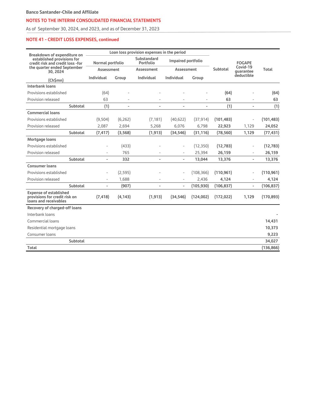 NOTE 41 - CREDIT LOSS EXPENSES, continued Breakdown of expenditure on established provisions for credit risk and credit loss -for the quarter ended September 30, 2024 Loan loss provision expenses in the period Normal portfolio Substandard Portfolio Impaired portfolio Subtotal FOGAPE Covid-19 guarantee deductible Assessment Assessment Assessment Total Individual Group Individual Individual Group(Ch$mn) Interbank loans Provisions established (64) - - - - (64) - (64) Provision released 63 - - - - 63 - 63 Subtotal (1) - - - - (1) - (1) Commercial loans Provisions established (9,504) (6,262) (7,181) (40,622) (37,914) (101,483) - (101,483) Provision released 2,087 2,694 5,268 6,076 6,798 22,923 1,129 24,052 Subtotal (7,417) (3,568) (1,913) (34,546) (31,116) (78,560) 1,129 (77,431) Mortgage loans Provisions established - (433) - - (12,350) (12,783) - (12,783) Provision released - 765 - - 25,394 26,159 - 26,159 Subtotal - 332 - - 13,044 13,376 - 13,376 Consumer loans Provisions established - (2,595) - - (108,366) (110,961) - (110,961) Provision released - 1,688 - - 2,436 4,124 - 4,124 Subtotal - (907) - - (105,930) (106,837) - (106,837) Expense of established provisions for credit risk on loans and receivables (7,418) (4,143) (1,913) (34,546) (124,002) (172,022) 1,129 (170,893) Recovery of charged-off loans Interbank loans - Commercial loans 14,431 Residential mortgage loans 10,373 Consumer loans 9,223 Subtotal 34,027 Total (136,866) Banco Santander-Chile and Affiliate NOTES TO THE INTERIM CONSOLIDATED FINANCIAL STATEMENTS As of September 30, 2024, and 2023, and as of December 31, 2023
