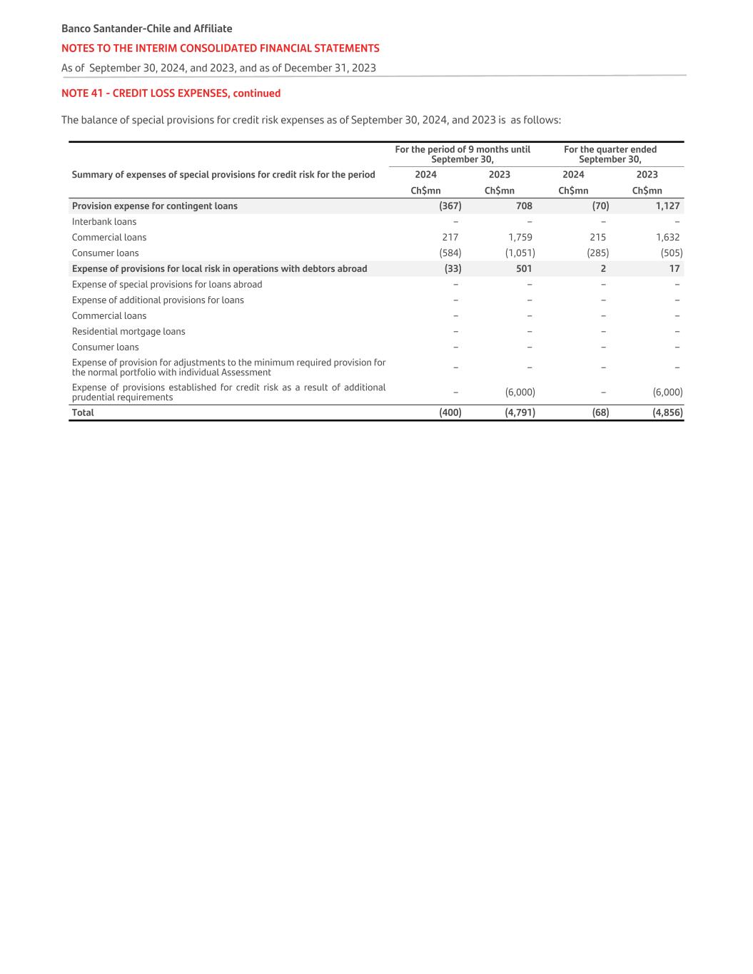 NOTE 41 - CREDIT LOSS EXPENSES, continued The balance of special provisions for credit risk expenses as of September 30, 2024, and 2023 is as follows: For the period of 9 months until September 30, For the quarter ended September 30, Summary of expenses of special provisions for credit risk for the period 2024 2023 2024 2023 Ch$mn Ch$mn Ch$mn Ch$mn Provision expense for contingent loans (367) 708 (70) 1,127 Interbank loans – – – – Commercial loans 217 1,759 215 1,632 Consumer loans (584) (1,051) (285) (505) Expense of provisions for local risk in operations with debtors abroad (33) 501 2 17 Expense of special provisions for loans abroad – – – – Expense of additional provisions for loans – – – – Commercial loans – – – – Residential mortgage loans – – – – Consumer loans – – – – Expense of provision for adjustments to the minimum required provision for the normal portfolio with individual Assessment – – – – Expense of provisions established for credit risk as a result of additional prudential requirements – (6,000) – (6,000) Total (400) (4,791) (68) (4,856) Banco Santander-Chile and Affiliate NOTES TO THE INTERIM CONSOLIDATED FINANCIAL STATEMENTS As of September 30, 2024, and 2023, and as of December 31, 2023