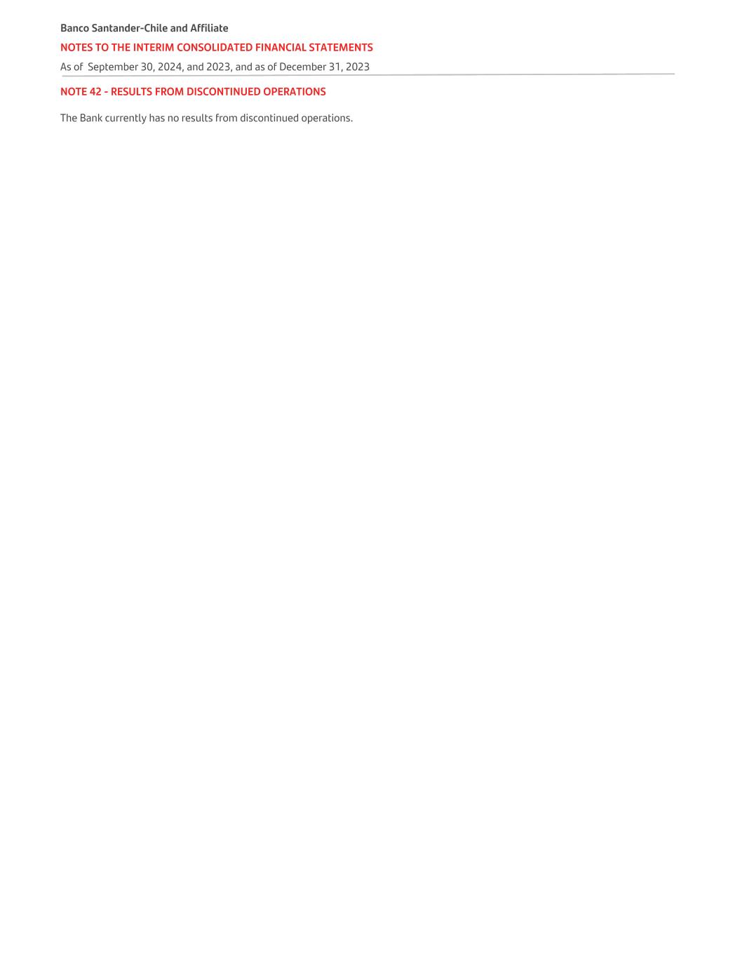 NOTE 42 - RESULTS FROM DISCONTINUED OPERATIONS The Bank currently has no results from discontinued operations. Banco Santander-Chile and Affiliate NOTES TO THE INTERIM CONSOLIDATED FINANCIAL STATEMENTS As of September 30, 2024, and 2023, and as of December 31, 2023