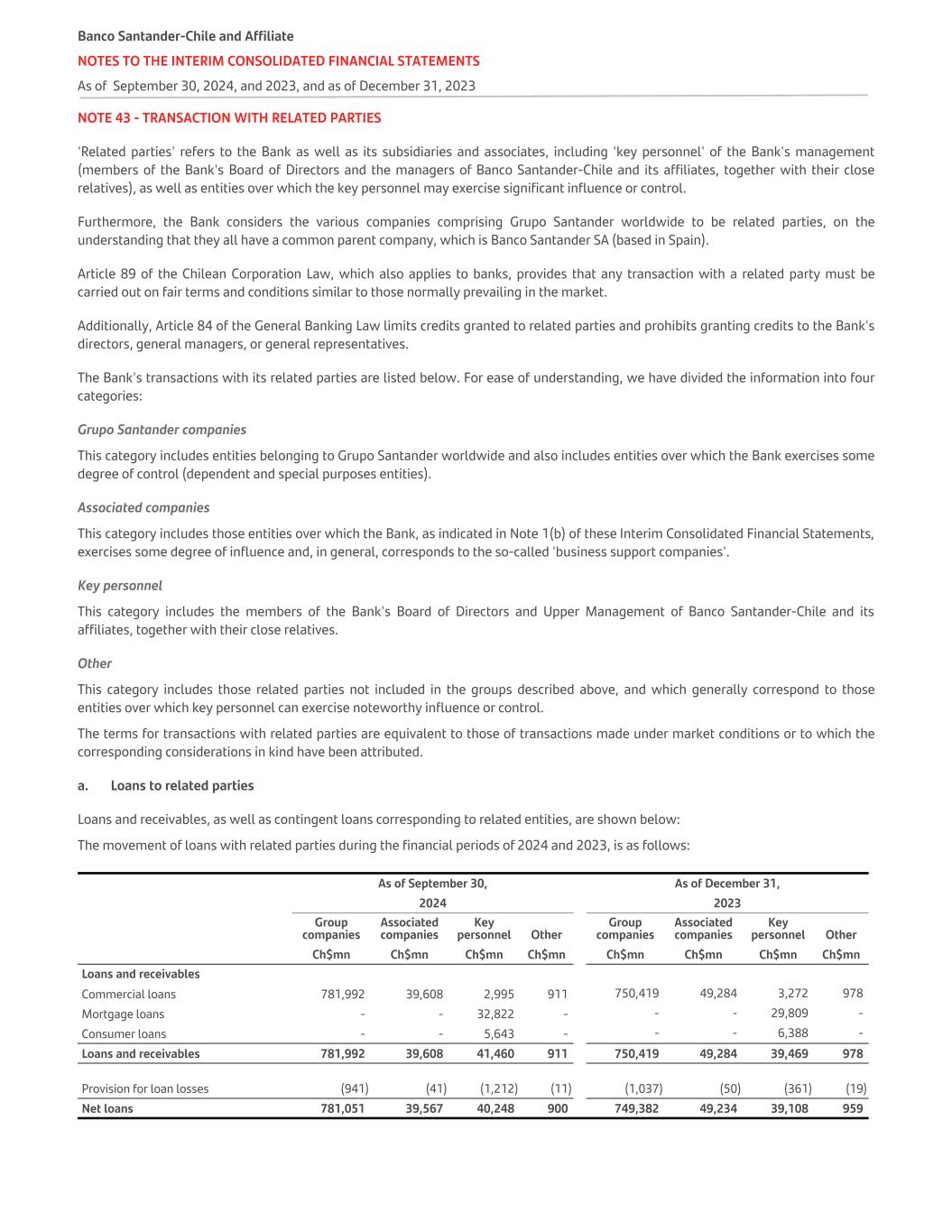 NOTE 43 - TRANSACTION WITH RELATED PARTIES 'Related parties' refers to the Bank as well as its subsidiaries and associates, including 'key personnel' of the Bank's management (members of the Bank's Board of Directors and the managers of Banco Santander-Chile and its affiliates, together with their close relatives), as well as entities over which the key personnel may exercise significant influence or control. Furthermore, the Bank considers the various companies comprising Grupo Santander worldwide to be related parties, on the understanding that they all have a common parent company, which is Banco Santander SA (based in Spain). Article 89 of the Chilean Corporation Law, which also applies to banks, provides that any transaction with a related party must be carried out on fair terms and conditions similar to those normally prevailing in the market. Additionally, Article 84 of the General Banking Law limits credits granted to related parties and prohibits granting credits to the Bank's directors, general managers, or general representatives. The Bank's transactions with its related parties are listed below. For ease of understanding, we have divided the information into four categories: Grupo Santander companies This category includes entities belonging to Grupo Santander worldwide and also includes entities over which the Bank exercises some degree of control (dependent and special purposes entities). Associated companies This category includes those entities over which the Bank, as indicated in Note 1(b) of these Interim Consolidated Financial Statements, exercises some degree of influence and, in general, corresponds to the so-called 'business support companies'. Key personnel This category includes the members of the Bank's Board of Directors and Upper Management of Banco Santander-Chile and its affiliates, together with their close relatives. Other This category includes those related parties not included in the groups described above, and which generally correspond to those entities over which key personnel can exercise noteworthy influence or control. The terms for transactions with related parties are equivalent to those of transactions made under market conditions or to which the corresponding considerations in kind have been attributed. a. Loans to related parties Loans and receivables, as well as contingent loans corresponding to related entities, are shown below: The movement of loans with related parties during the financial periods of 2024 and 2023, is as follows: As of September 30, As of December 31,   2024 2023   Group companies Associated companies Key personnel Other Group companies Associated companies Key personnel Other   Ch$mn Ch$mn Ch$mn Ch$mn Ch$mn Ch$mn Ch$mn Ch$mn Loans and receivables Commercial loans 781,992 39,608 2,995 911 750,419 49,284 3,272 978 Mortgage loans - - 32,822 - - - 29,809 - Consumer loans - - 5,643 - - - 6,388 - Loans and receivables 781,992 39,608 41,460 911 750,419 49,284 39,469 978 Provision for loan losses (941) (41) (1,212) (11) (1,037) (50) (361) (19) Net loans 781,051 39,567 40,248 900 749,382 49,234 39,108 959 Banco Santander-Chile and Affiliate NOTES TO THE INTERIM CONSOLIDATED FINANCIAL STATEMENTS As of September 30, 2024, and 2023, and as of December 31, 2023