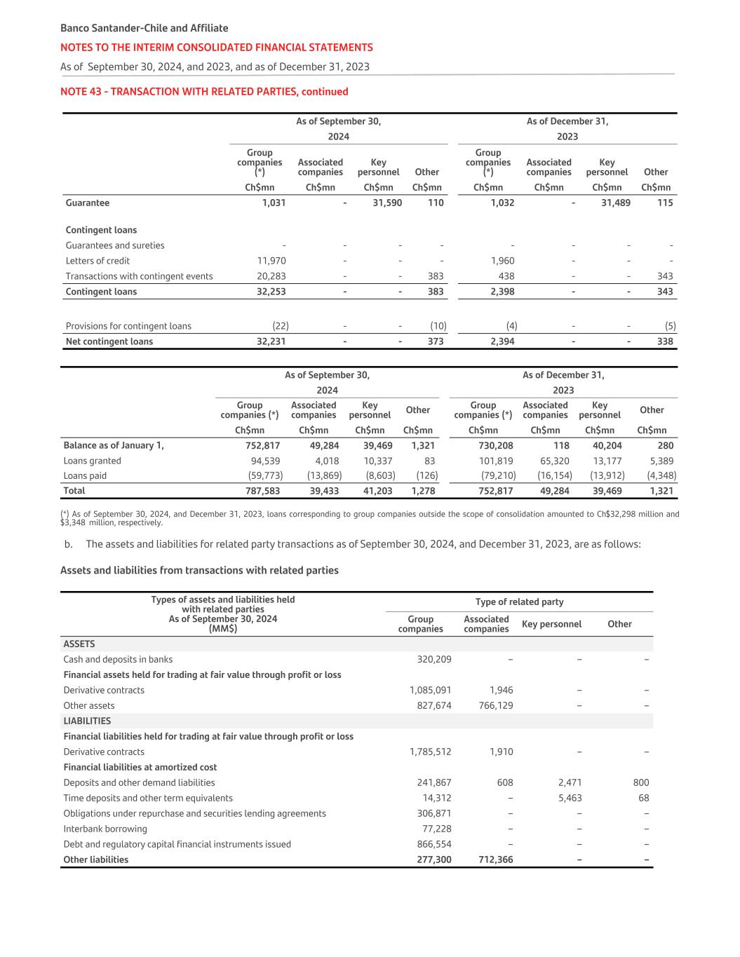 NOTE 43 - TRANSACTION WITH RELATED PARTIES, continued As of September 30, As of December 31,   2024 2023   Group companies (*) Associated companies Key personnel Other Group companies (*) Associated companies Key personnel Other   Ch$mn Ch$mn Ch$mn Ch$mn Ch$mn Ch$mn Ch$mn Ch$mn Guarantee 1,031 - 31,590 110 1,032 - 31,489 115 Contingent loans Guarantees and sureties - - - - - - - - Letters of credit 11,970 - - - 1,960 - - - Transactions with contingent events 20,283 - - 383 438 - - 343 Contingent loans 32,253 - - 383 2,398 - - 343 Provisions for contingent loans (22) - - (10) (4) - - (5) Net contingent loans 32,231 - - 373 2,394 - - 338   As of September 30, As of December 31,   2024 2023   Group companies (*) Associated companies Key personnel Other Group companies (*) Associated companies Key personnel Other   Ch$mn Ch$mn Ch$mn Ch$mn Ch$mn Ch$mn Ch$mn Ch$mn Balance as of January 1, 752,817 49,284 39,469 1,321 730,208 118 40,204 280 Loans granted 94,539 4,018 10,337 83 101,819 65,320 13,177 5,389 Loans paid (59,773) (13,869) (8,603) (126) (79,210) (16,154) (13,912) (4,348) Total 787,583 39,433 41,203 1,278 752,817 49,284 39,469 1,321 (*) As of September 30, 2024, and December 31, 2023, loans corresponding to group companies outside the scope of consolidation amounted to Ch$32,298 million and $3,348 million, respectively. b. The assets and liabilities for related party transactions as of September 30, 2024, and December 31, 2023, are as follows: Assets and liabilities from transactions with related parties Types of assets and liabilities held with related parties As of September 30, 2024 (MM$) Type of related party Group companies Associated companies Key personnel Other ASSETS Cash and deposits in banks 320,209 – – – Financial assets held for trading at fair value through profit or loss Derivative contracts 1,085,091 1,946 – – Other assets 827,674 766,129 – – LIABILITIES Financial liabilities held for trading at fair value through profit or loss Derivative contracts 1,785,512 1,910 – – Financial liabilities at amortized cost Deposits and other demand liabilities 241,867 608 2,471 800 Time deposits and other term equivalents 14,312 – 5,463 68 Obligations under repurchase and securities lending agreements 306,871 – – – Interbank borrowing 77,228 – – – Debt and regulatory capital financial instruments issued 866,554 – – – Other liabilities 277,300 712,366 – – Banco Santander-Chile and Affiliate NOTES TO THE INTERIM CONSOLIDATED FINANCIAL STATEMENTS As of September 30, 2024, and 2023, and as of December 31, 2023
