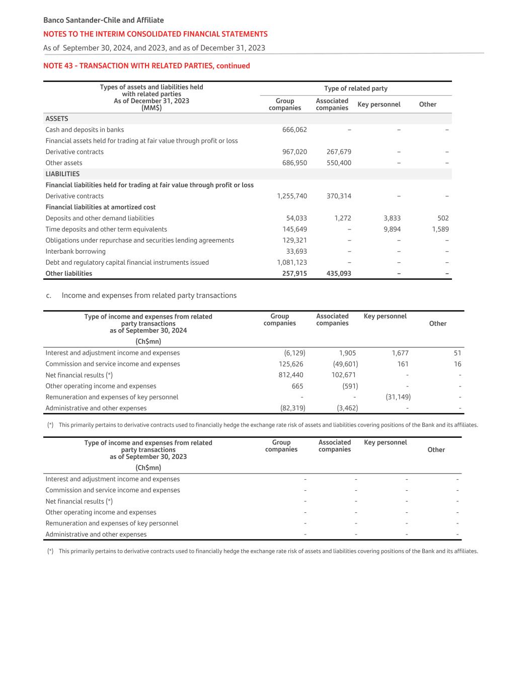 NOTE 43 - TRANSACTION WITH RELATED PARTIES, continued Types of assets and liabilities held with related parties As of December 31, 2023 (MM$) Type of related party Group companies Associated companies Key personnel Other ASSETS Cash and deposits in banks 666,062 – – – Financial assets held for trading at fair value through profit or loss Derivative contracts 967,020 267,679 – – Other assets 686,950 550,400 – – LIABILITIES Financial liabilities held for trading at fair value through profit or loss Derivative contracts 1,255,740 370,314 – – Financial liabilities at amortized cost Deposits and other demand liabilities 54,033 1,272 3,833 502 Time deposits and other term equivalents 145,649 – 9,894 1,589 Obligations under repurchase and securities lending agreements 129,321 – – – Interbank borrowing 33,693 – – – Debt and regulatory capital financial instruments issued 1,081,123 – – – Other liabilities 257,915 435,093 – – c. Income and expenses from related party transactions Type of income and expenses from related party transactions as of September 30, 2024 Group companies Associated companies Key personnel Other (Ch$mn)       Interest and adjustment income and expenses (6,129) 1,905 1,677 51 Commission and service income and expenses 125,626 (49,601) 161 16 Net financial results (*) 812,440 102,671 - - Other operating income and expenses 665 (591) - - Remuneration and expenses of key personnel - - (31,149) - Administrative and other expenses (82,319) (3,462) - - (*) This primarily pertains to derivative contracts used to financially hedge the exchange rate risk of assets and liabilities covering positions of the Bank and its affiliates. Type of income and expenses from related party transactions as of September 30, 2023 Group companies Associated companies Key personnel Other (Ch$mn)       Interest and adjustment income and expenses - - - - Commission and service income and expenses - - - - Net financial results (*) - - - - Other operating income and expenses - - - - Remuneration and expenses of key personnel - - - - Administrative and other expenses - - - - (*) This primarily pertains to derivative contracts used to financially hedge the exchange rate risk of assets and liabilities covering positions of the Bank and its affiliates. Banco Santander-Chile and Affiliate NOTES TO THE INTERIM CONSOLIDATED FINANCIAL STATEMENTS As of September 30, 2024, and 2023, and as of December 31, 2023