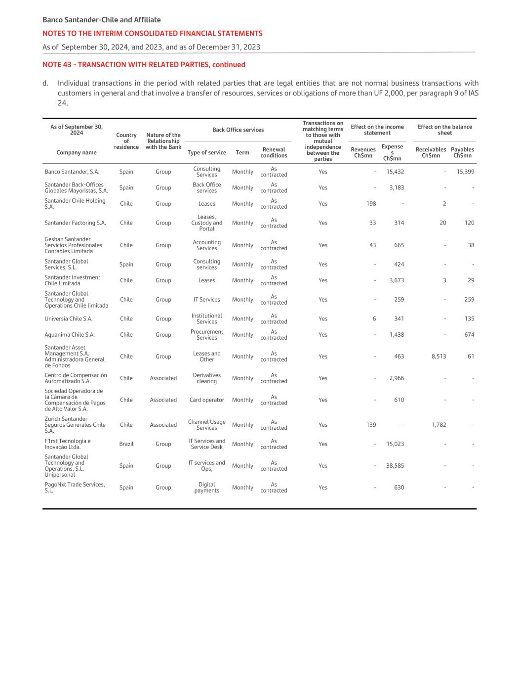 NOTE 43 - TRANSACTION WITH RELATED PARTIES, continued d. Individual transactions in the period with related parties that are legal entities that are not normal business transactions with customers in general and that involve a transfer of resources, services or obligations of more than UF 2,000, per paragraph 9 of IAS 24. As of September 30, 2024 Country of residence Nature of the Relationship with the Bank Back Office services Transactions on matching terms to those with mutual independence between the parties Effect on the income statement Effect on the balance sheet Company name Type of service Term Renewal conditions Revenues Ch$mn Expense s Ch$mn Receivables Ch$mn Payables Ch$mn Banco Santander, S.A. Spain Group Consulting Services Monthly As contracted Yes - 15,432 - 15,399 Santander Back-Offices Globales Mayoristas, S.A. Spain Group Back Office services Monthly As contracted Yes - 3,183 - - Santander Chile Holding S.A. Chile Group Leases Monthly As contracted Yes 198 - 2 - Santander Factoring S.A. Chile Group Leases, Custody and Portal Monthly As contracted Yes 33 314 20 120 Gesban Santander Servicios Profesionales Contables Limitada Chile Group Accounting Services Monthly As contracted Yes 43 665 - 38 Santander Global Services, S.L. Spain Group Consulting services Monthly As contracted Yes - 424 - - Santander Investment Chile Limitada Chile Group Leases Monthly As contracted Yes - 3,673 3 29 Santander Global Technology and Operations Chile limitada Chile Group IT Services Monthly As contracted Yes - 259 - 259 Universia Chile S.A. Chile Group Institutional Services Monthly As contracted Yes 6 341 - 135 Aquanima Chile S.A. Chile Group Procurement Services Monthly As contracted Yes - 1,438 - 674 Santander Asset Management S.A. Administradora General de Fondos Chile Group Leases and Other Monthly As contracted Yes - 463 8,513 61 Centro de Compensación Automatizado S.A. Chile Associated Derivatives clearing Monthly As contracted Yes - 2,966 - - Sociedad Operadora de la Cámara de Compensación de Pagos de Alto Valor S.A. Chile Associated Card operator Monthly As contracted Yes - 610 - - Zurich Santander Seguros Generales Chile S.A. Chile Associated Channel Usage Services Monthly As contracted Yes 139 - 1,782 - F1rst Tecnologia e Inovação Ltda. Brazil Group IT Services and Service Desk Monthly As contracted Yes - 15,023 - - Santander Global Technology and Operations, S.L. Unipersonal Spain Group IT services and Ops, Monthly As contracted Yes - 38,585 - - PagoNxt Trade Services, S.L. Spain Group Digital payments Monthly As contracted Yes - 630 - - Banco Santander-Chile and Affiliate NOTES TO THE INTERIM CONSOLIDATED FINANCIAL STATEMENTS As of September 30, 2024, and 2023, and as of December 31, 2023