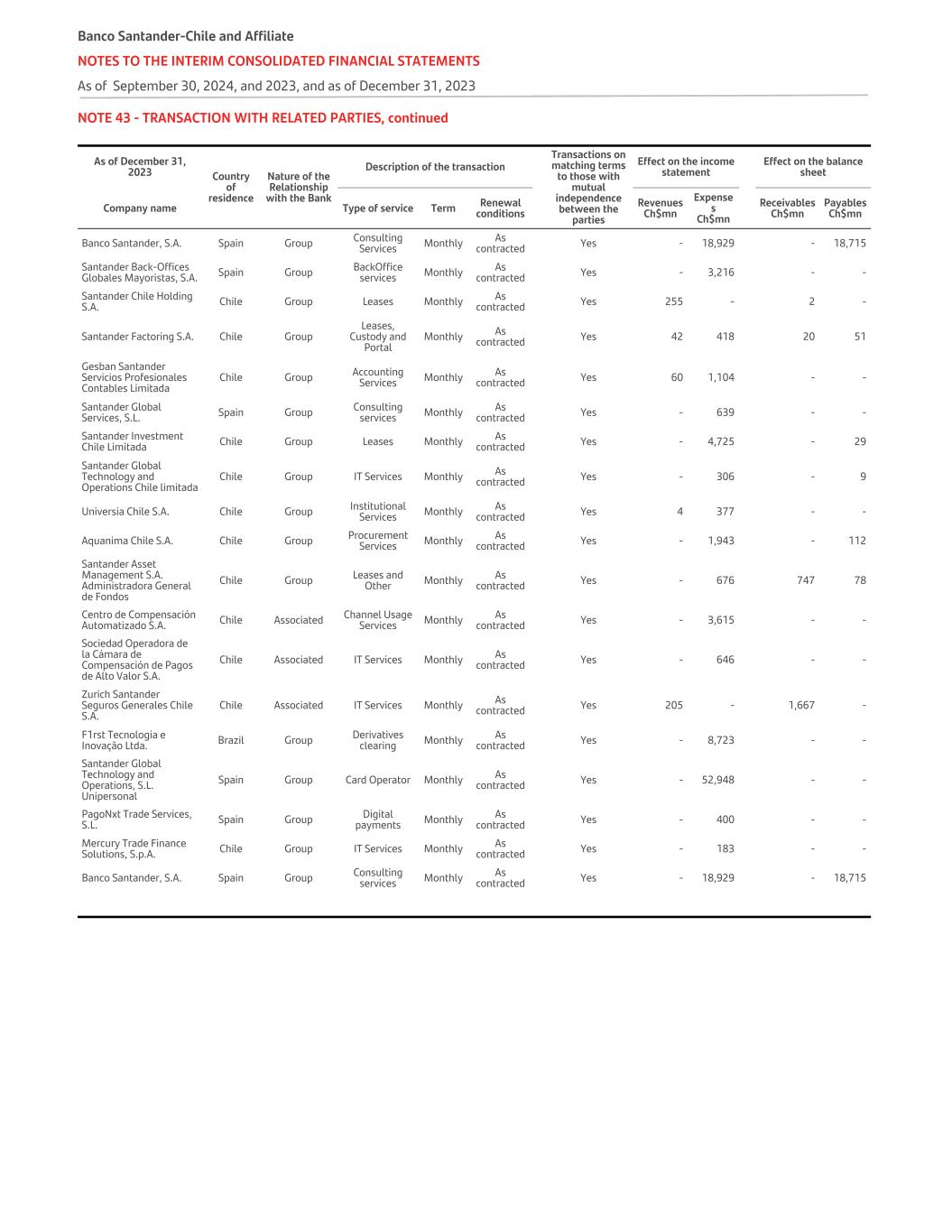 NOTE 43 - TRANSACTION WITH RELATED PARTIES, continued As of December 31, 2023 Country of residence Nature of the Relationship with the Bank Description of the transaction Transactions on matching terms to those with mutual independence between the parties Effect on the income statement Effect on the balance sheet Company name Type of service Term Renewal conditions Revenues Ch$mn Expense s Ch$mn Receivables Ch$mn Payables Ch$mn Banco Santander, S.A. Spain Group Consulting Services Monthly As contracted Yes - 18,929 - 18,715 Santander Back-Offices Globales Mayoristas, S.A. Spain Group BackOffice services Monthly As contracted Yes - 3,216 - - Santander Chile Holding S.A. Chile Group Leases Monthly As contracted Yes 255 - 2 - Santander Factoring S.A. Chile Group Leases, Custody and Portal Monthly As contracted Yes 42 418 20 51 Gesban Santander Servicios Profesionales Contables Limitada Chile Group Accounting Services Monthly As contracted Yes 60 1,104 - - Santander Global Services, S.L. Spain Group Consulting services Monthly As contracted Yes - 639 - - Santander Investment Chile Limitada Chile Group Leases Monthly As contracted Yes - 4,725 - 29 Santander Global Technology and Operations Chile limitada Chile Group IT Services Monthly As contracted Yes - 306 - 9 Universia Chile S.A. Chile Group Institutional Services Monthly As contracted Yes 4 377 - - Aquanima Chile S.A. Chile Group Procurement Services Monthly As contracted Yes - 1,943 - 112 Santander Asset Management S.A. Administradora General de Fondos Chile Group Leases and Other Monthly As contracted Yes - 676 747 78 Centro de Compensación Automatizado S.A. Chile Associated Channel Usage Services Monthly As contracted Yes - 3,615 - - Sociedad Operadora de la Cámara de Compensación de Pagos de Alto Valor S.A. Chile Associated IT Services Monthly As contracted Yes - 646 - - Zurich Santander Seguros Generales Chile S.A. Chile Associated IT Services Monthly As contracted Yes 205 - 1,667 - F1rst Tecnologia e Inovação Ltda. Brazil Group Derivatives clearing Monthly As contracted Yes - 8,723 - - Santander Global Technology and Operations, S.L. Unipersonal Spain Group Card Operator Monthly As contracted Yes - 52,948 - - PagoNxt Trade Services, S.L. Spain Group Digital payments Monthly As contracted Yes - 400 - - Mercury Trade Finance Solutions, S.p.A. Chile Group IT Services Monthly As contracted Yes - 183 - - Banco Santander, S.A. Spain Group Consulting services Monthly As contracted Yes - 18,929 - 18,715 Banco Santander-Chile and Affiliate NOTES TO THE INTERIM CONSOLIDATED FINANCIAL STATEMENTS As of September 30, 2024, and 2023, and as of December 31, 2023