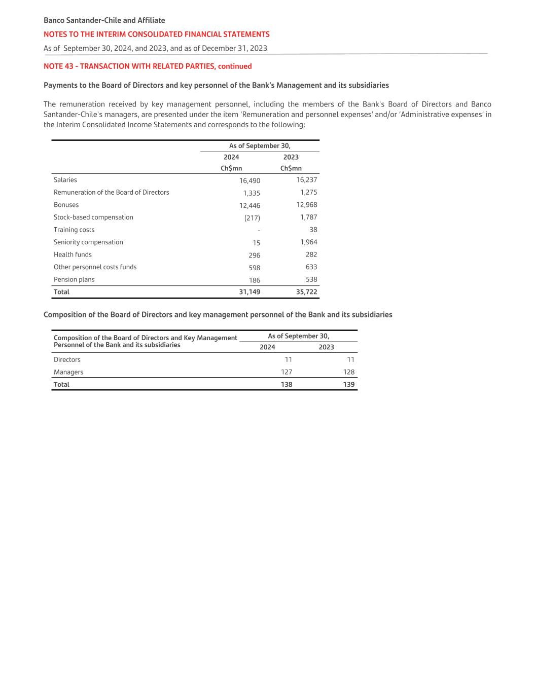NOTE 43 - TRANSACTION WITH RELATED PARTIES, continued Payments to the Board of Directors and key personnel of the Bank’s Management and its subsidiaries The remuneration received by key management personnel, including the members of the Bank's Board of Directors and Banco Santander-Chile's managers, are presented under the item ‘Remuneration and personnel expenses’ and/or ‘Administrative expenses’ in the Interim Consolidated Income Statements and corresponds to the following:   As of September 30,   2024 2023   Ch$mn Ch$mn Salaries 16,490 16,237 Remuneration of the Board of Directors 1,335 1,275 Bonuses 12,446 12,968 Stock-based compensation (217) 1,787 Training costs - 38 Seniority compensation 15 1,964 Health funds 296 282 Other personnel costs funds 598 633 Pension plans 186 538 Total 31,149 35,722 Composition of the Board of Directors and key management personnel of the Bank and its subsidiaries Composition of the Board of Directors and Key Management Personnel of the Bank and its subsidiaries As of September 30, 2024 2023 Directors 11 11 Managers 127 128 Total 138 139 Banco Santander-Chile and Affiliate NOTES TO THE INTERIM CONSOLIDATED FINANCIAL STATEMENTS As of September 30, 2024, and 2023, and as of December 31, 2023
