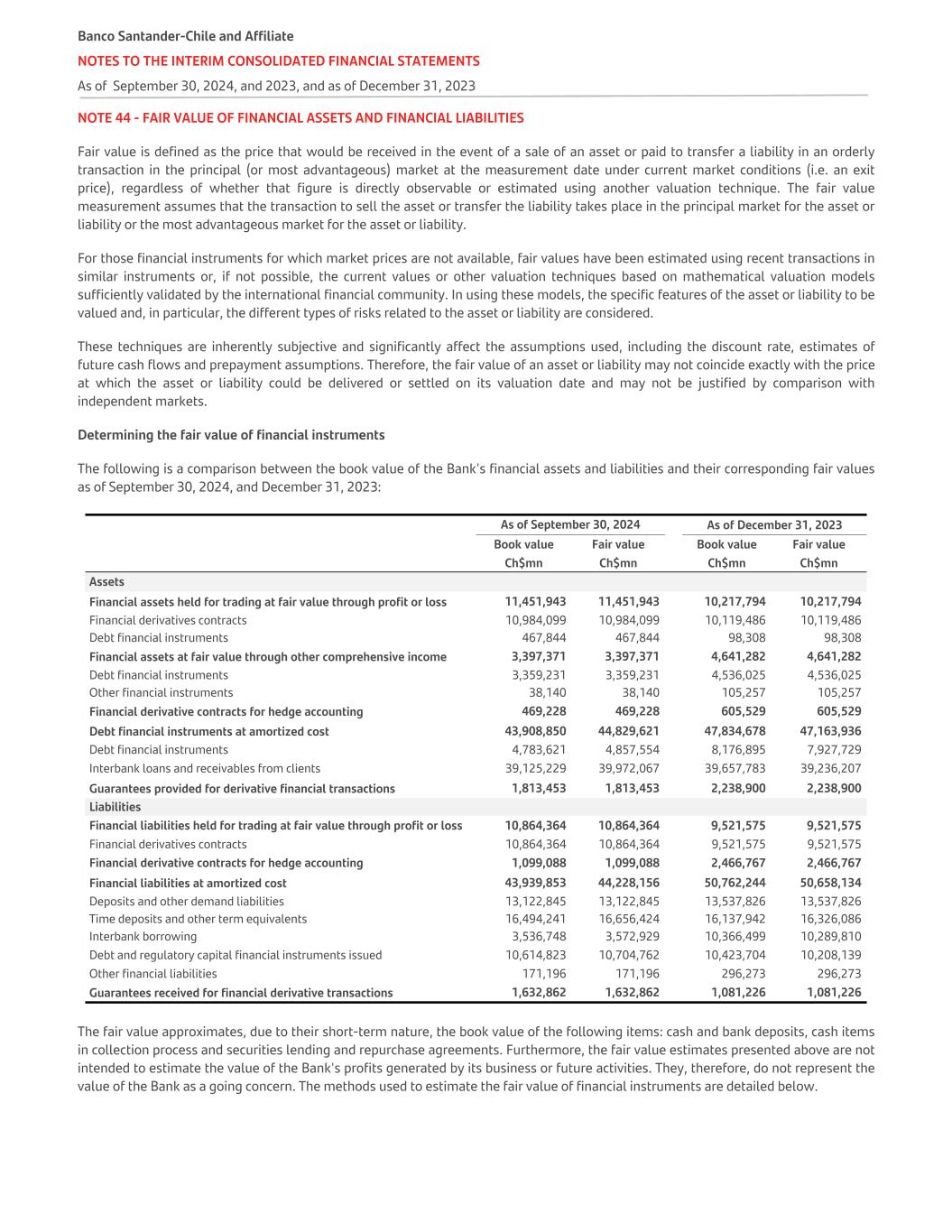 NOTE 44 - FAIR VALUE OF FINANCIAL ASSETS AND FINANCIAL LIABILITIES Fair value is defined as the price that would be received in the event of a sale of an asset or paid to transfer a liability in an orderly transaction in the principal (or most advantageous) market at the measurement date under current market conditions (i.e. an exit price), regardless of whether that figure is directly observable or estimated using another valuation technique. The fair value measurement assumes that the transaction to sell the asset or transfer the liability takes place in the principal market for the asset or liability or the most advantageous market for the asset or liability. For those financial instruments for which market prices are not available, fair values have been estimated using recent transactions in similar instruments or, if not possible, the current values or other valuation techniques based on mathematical valuation models sufficiently validated by the international financial community. In using these models, the specific features of the asset or liability to be valued and, in particular, the different types of risks related to the asset or liability are considered. These techniques are inherently subjective and significantly affect the assumptions used, including the discount rate, estimates of future cash flows and prepayment assumptions. Therefore, the fair value of an asset or liability may not coincide exactly with the price at which the asset or liability could be delivered or settled on its valuation date and may not be justified by comparison with independent markets. Determining the fair value of financial instruments The following is a comparison between the book value of the Bank's financial assets and liabilities and their corresponding fair values as of September 30, 2024, and December 31, 2023: As of September 30, 2024 As of December 31, 2023 Book value Fair value Book value Fair value   Ch$mn Ch$mn Ch$mn Ch$mn Assets Financial assets held for trading at fair value through profit or loss 11,451,943 11,451,943 10,217,794 10,217,794 Financial derivatives contracts 10,984,099 10,984,099 10,119,486 10,119,486 Debt financial instruments 467,844 467,844 98,308 98,308 Financial assets at fair value through other comprehensive income 3,397,371 3,397,371 4,641,282 4,641,282 Debt financial instruments 3,359,231 3,359,231 4,536,025 4,536,025 Other financial instruments 38,140 38,140 105,257 105,257 Financial derivative contracts for hedge accounting 469,228 469,228 605,529 605,529 Debt financial instruments at amortized cost 43,908,850 44,829,621 47,834,678 47,163,936 Debt financial instruments 4,783,621 4,857,554 8,176,895 7,927,729 Interbank loans and receivables from clients 39,125,229 39,972,067 39,657,783 39,236,207 Guarantees provided for derivative financial transactions 1,813,453 1,813,453 2,238,900 2,238,900 Liabilities Financial liabilities held for trading at fair value through profit or loss 10,864,364 10,864,364 9,521,575 9,521,575 Financial derivatives contracts 10,864,364 10,864,364 9,521,575 9,521,575 Financial derivative contracts for hedge accounting 1,099,088 1,099,088 2,466,767 2,466,767 Financial liabilities at amortized cost 43,939,853 44,228,156 50,762,244 50,658,134 Deposits and other demand liabilities 13,122,845 13,122,845 13,537,826 13,537,826 Time deposits and other term equivalents 16,494,241 16,656,424 16,137,942 16,326,086 Interbank borrowing 3,536,748 3,572,929 10,366,499 10,289,810 Debt and regulatory capital financial instruments issued 10,614,823 10,704,762 10,423,704 10,208,139 Other financial liabilities 171,196 171,196 296,273 296,273 Guarantees received for financial derivative transactions 1,632,862 1,632,862 1,081,226 1,081,226 The fair value approximates, due to their short-term nature, the book value of the following items: cash and bank deposits, cash items in collection process and securities lending and repurchase agreements. Furthermore, the fair value estimates presented above are not intended to estimate the value of the Bank's profits generated by its business or future activities. They, therefore, do not represent the value of the Bank as a going concern. The methods used to estimate the fair value of financial instruments are detailed below. Banco Santander-Chile and Affiliate NOTES TO THE INTERIM CONSOLIDATED FINANCIAL STATEMENTS As of September 30, 2024, and 2023, and as of December 31, 2023