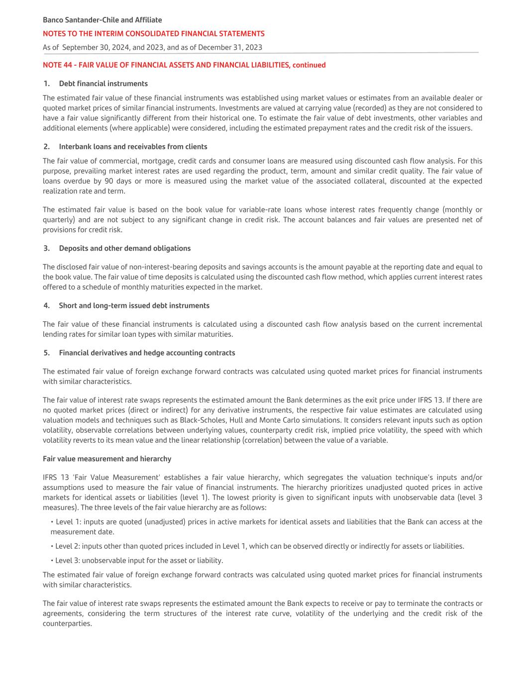 NOTE 44 - FAIR VALUE OF FINANCIAL ASSETS AND FINANCIAL LIABILITIES, continued 1. Debt financial instruments The estimated fair value of these financial instruments was established using market values or estimates from an available dealer or quoted market prices of similar financial instruments. Investments are valued at carrying value (recorded) as they are not considered to have a fair value significantly different from their historical one. To estimate the fair value of debt investments, other variables and additional elements (where applicable) were considered, including the estimated prepayment rates and the credit risk of the issuers. 2. Interbank loans and receivables from clients The fair value of commercial, mortgage, credit cards and consumer loans are measured using discounted cash flow analysis. For this purpose, prevailing market interest rates are used regarding the product, term, amount and similar credit quality. The fair value of loans overdue by 90 days or more is measured using the market value of the associated collateral, discounted at the expected realization rate and term. The estimated fair value is based on the book value for variable-rate loans whose interest rates frequently change (monthly or quarterly) and are not subject to any significant change in credit risk. The account balances and fair values are presented net of provisions for credit risk. 3. Deposits and other demand obligations The disclosed fair value of non-interest-bearing deposits and savings accounts is the amount payable at the reporting date and equal to the book value. The fair value of time deposits is calculated using the discounted cash flow method, which applies current interest rates offered to a schedule of monthly maturities expected in the market. 4. Short and long-term issued debt instruments The fair value of these financial instruments is calculated using a discounted cash flow analysis based on the current incremental lending rates for similar loan types with similar maturities. 5. Financial derivatives and hedge accounting contracts The estimated fair value of foreign exchange forward contracts was calculated using quoted market prices for financial instruments with similar characteristics. The fair value of interest rate swaps represents the estimated amount the Bank determines as the exit price under IFRS 13. If there are no quoted market prices (direct or indirect) for any derivative instruments, the respective fair value estimates are calculated using valuation models and techniques such as Black-Scholes, Hull and Monte Carlo simulations. It considers relevant inputs such as option volatility, observable correlations between underlying values, counterparty credit risk, implied price volatility, the speed with which volatility reverts to its mean value and the linear relationship (correlation) between the value of a variable. Fair value measurement and hierarchy IFRS 13 'Fair Value Measurement' establishes a fair value hierarchy, which segregates the valuation technique's inputs and/or assumptions used to measure the fair value of financial instruments. The hierarchy prioritizes unadjusted quoted prices in active markets for identical assets or liabilities (level 1). The lowest priority is given to significant inputs with unobservable data (level 3 measures). The three levels of the fair value hierarchy are as follows: • Level 1: inputs are quoted (unadjusted) prices in active markets for identical assets and liabilities that the Bank can access at the measurement date. • Level 2: inputs other than quoted prices included in Level 1, which can be observed directly or indirectly for assets or liabilities. • Level 3: unobservable input for the asset or liability. The estimated fair value of foreign exchange forward contracts was calculated using quoted market prices for financial instruments with similar characteristics. The fair value of interest rate swaps represents the estimated amount the Bank expects to receive or pay to terminate the contracts or agreements, considering the term structures of the interest rate curve, volatility of the underlying and the credit risk of the counterparties. Banco Santander-Chile and Affiliate NOTES TO THE INTERIM CONSOLIDATED FINANCIAL STATEMENTS As of September 30, 2024, and 2023, and as of December 31, 2023