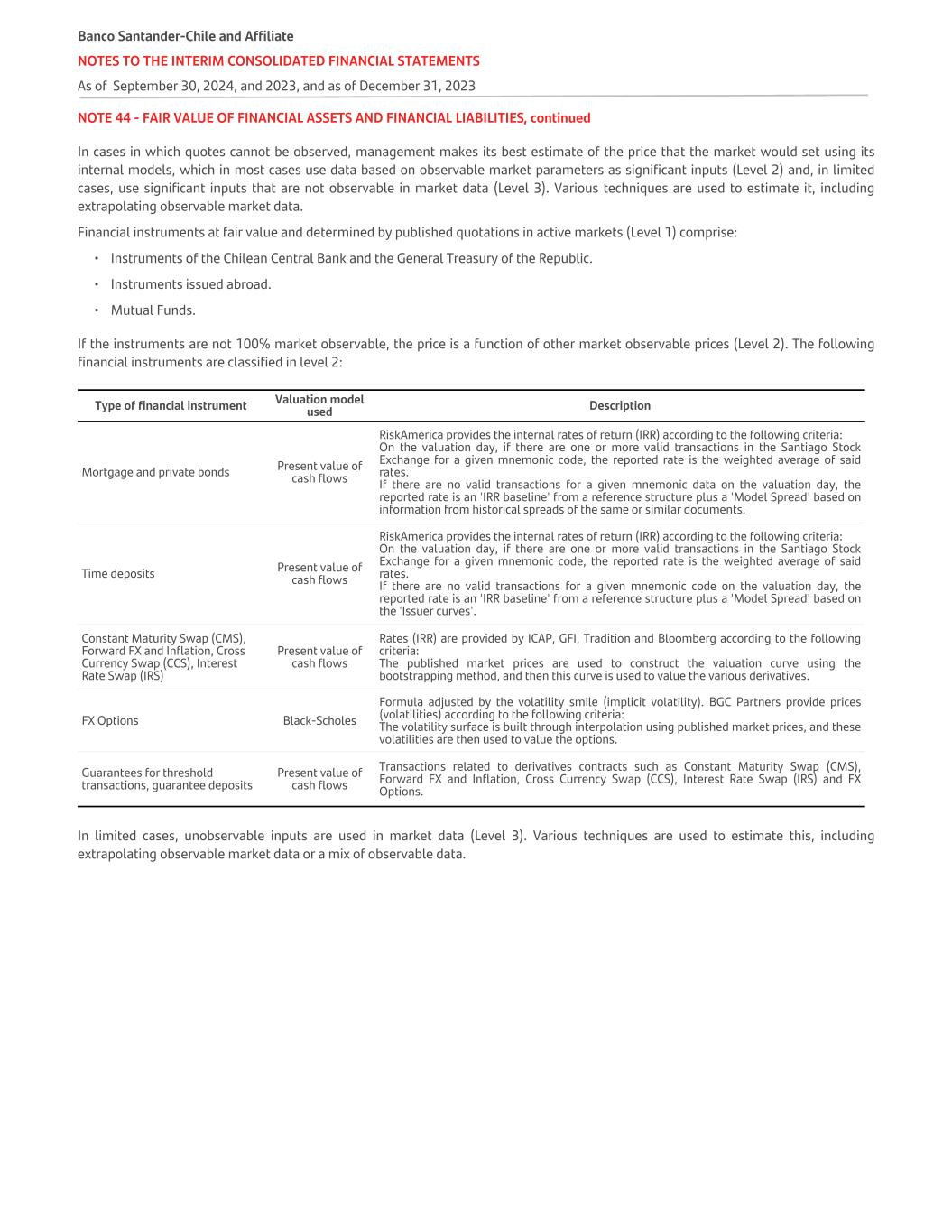 NOTE 44 - FAIR VALUE OF FINANCIAL ASSETS AND FINANCIAL LIABILITIES, continued In cases in which quotes cannot be observed, management makes its best estimate of the price that the market would set using its internal models, which in most cases use data based on observable market parameters as significant inputs (Level 2) and, in limited cases, use significant inputs that are not observable in market data (Level 3). Various techniques are used to estimate it, including extrapolating observable market data. Financial instruments at fair value and determined by published quotations in active markets (Level 1) comprise: • Instruments of the Chilean Central Bank and the General Treasury of the Republic. • Instruments issued abroad. • Mutual Funds. If the instruments are not 100% market observable, the price is a function of other market observable prices (Level 2). The following financial instruments are classified in level 2: Type of financial instrument Valuation model used Description Mortgage and private bonds Present value of cash flows RiskAmerica provides the internal rates of return (IRR) according to the following criteria: On the valuation day, if there are one or more valid transactions in the Santiago Stock Exchange for a given mnemonic code, the reported rate is the weighted average of said rates. If there are no valid transactions for a given mnemonic data on the valuation day, the reported rate is an 'IRR baseline' from a reference structure plus a 'Model Spread' based on information from historical spreads of the same or similar documents. Time deposits Present value of cash flows RiskAmerica provides the internal rates of return (IRR) according to the following criteria: On the valuation day, if there are one or more valid transactions in the Santiago Stock Exchange for a given mnemonic code, the reported rate is the weighted average of said rates. If there are no valid transactions for a given mnemonic code on the valuation day, the reported rate is an 'IRR baseline' from a reference structure plus a 'Model Spread' based on the 'Issuer curves'. Constant Maturity Swap (CMS), Forward FX and Inflation, Cross Currency Swap (CCS), Interest Rate Swap (IRS) Present value of cash flows Rates (IRR) are provided by ICAP, GFI, Tradition and Bloomberg according to the following criteria: The published market prices are used to construct the valuation curve using the bootstrapping method, and then this curve is used to value the various derivatives. FX Options Black-Scholes Formula adjusted by the volatility smile (implicit volatility). BGC Partners provide prices (volatilities) according to the following criteria: The volatility surface is built through interpolation using published market prices, and these volatilities are then used to value the options. Guarantees for threshold transactions, guarantee deposits Present value of cash flows Transactions related to derivatives contracts such as Constant Maturity Swap (CMS), Forward FX and Inflation, Cross Currency Swap (CCS), Interest Rate Swap (IRS) and FX Options. In limited cases, unobservable inputs are used in market data (Level 3). Various techniques are used to estimate this, including extrapolating observable market data or a mix of observable data. Banco Santander-Chile and Affiliate NOTES TO THE INTERIM CONSOLIDATED FINANCIAL STATEMENTS As of September 30, 2024, and 2023, and as of December 31, 2023